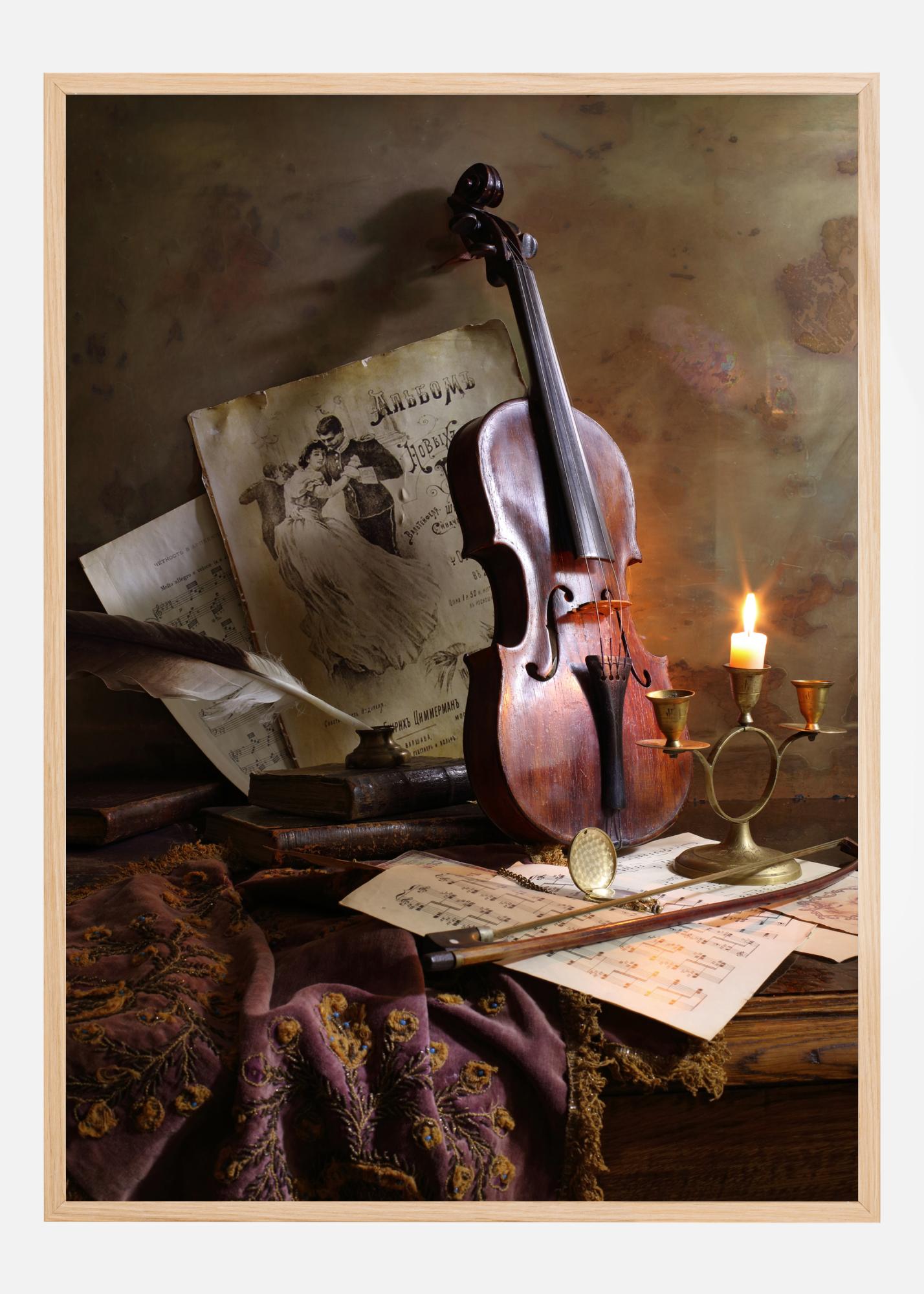 Ein Stillleben-Poster mit einer Geige und Notenblättern. Eine sanfte Kerze brennt hell und beleuchtet die mahagonifarbene Geige, die an der Wand lehnt. Ein Tuch, Notenblätter, Federkiel, Bogen und andere Utensilien füllen die Szene und verleihen dem Raum eine warme, reiche Atmosphäre.