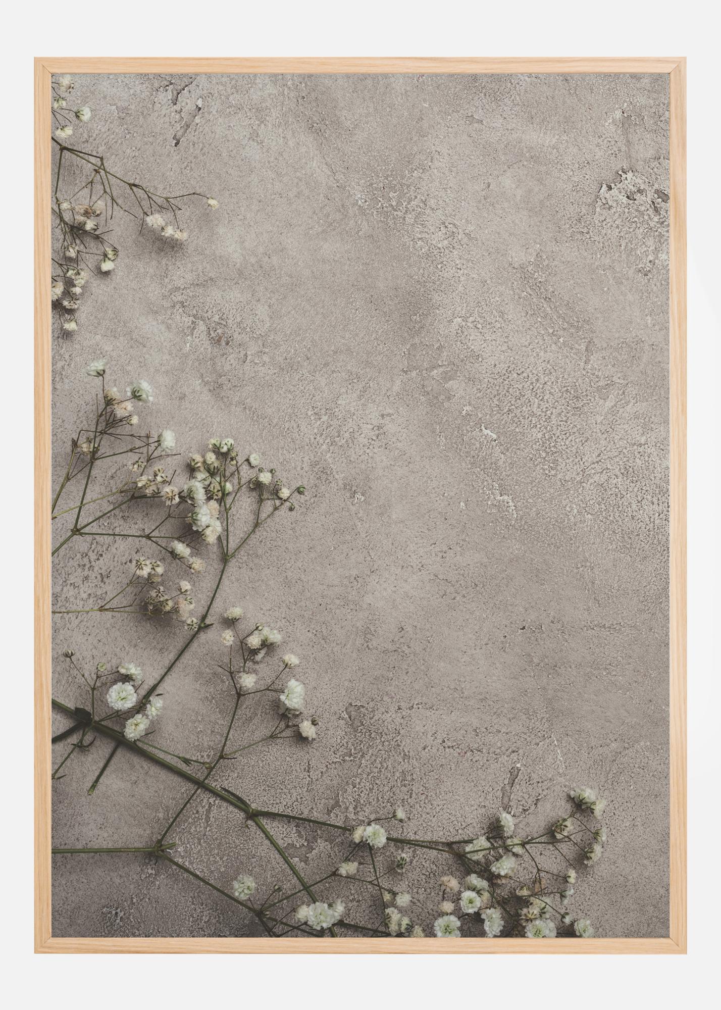 Ein Natur-Poster mit blühenden Pflanzenstängeln, die über einen Steinboden verstreut sind. Die zarten weißen Blüten und ihre dunkleren verzweigten Stängel passen zu den Mustern des strukturierten hellgrauen Bodens. Eine Mischung aus weichen und harten Elementen schafft dieses faszinierende Bild.