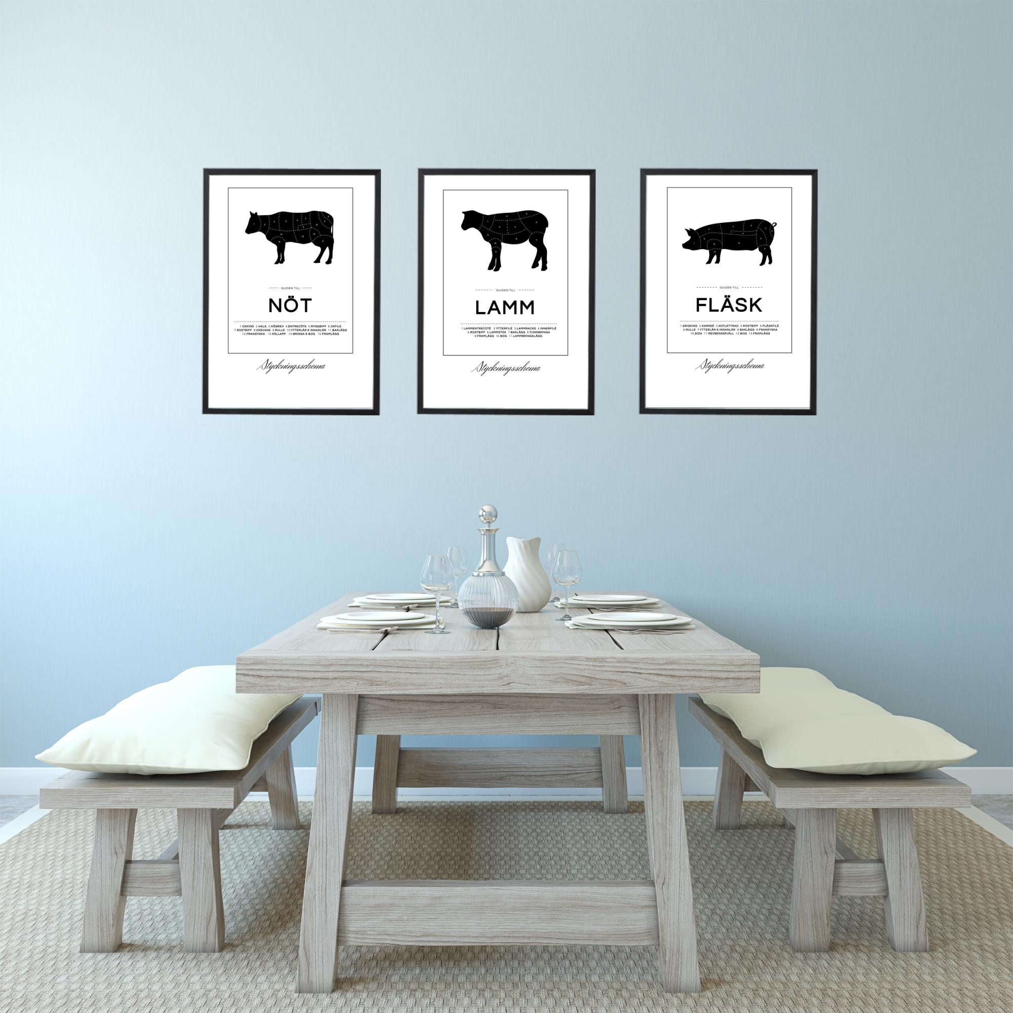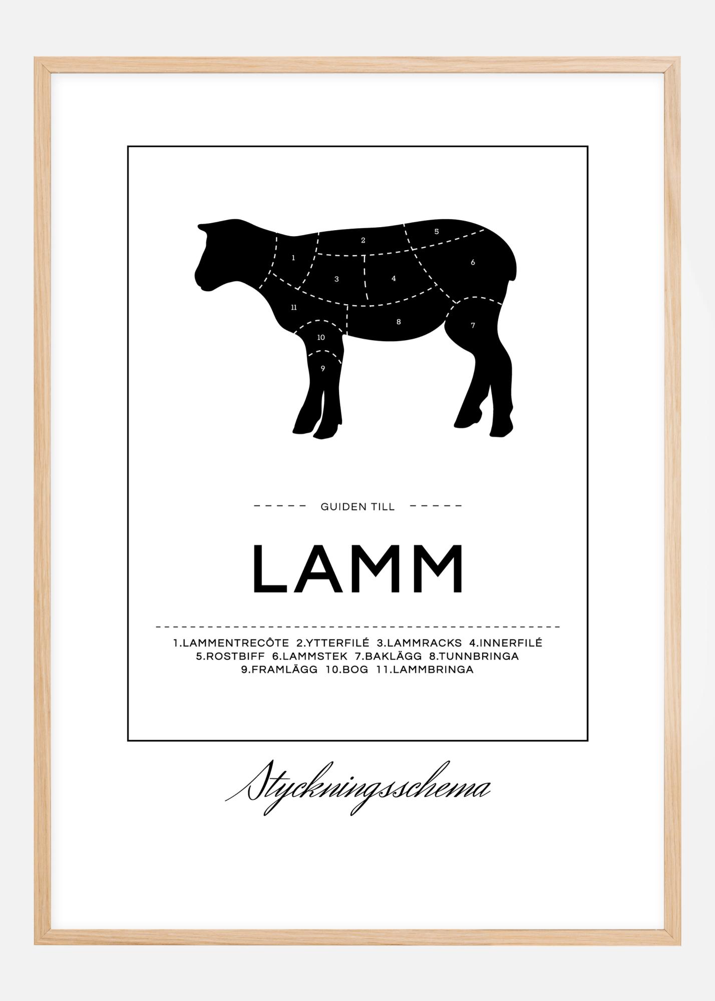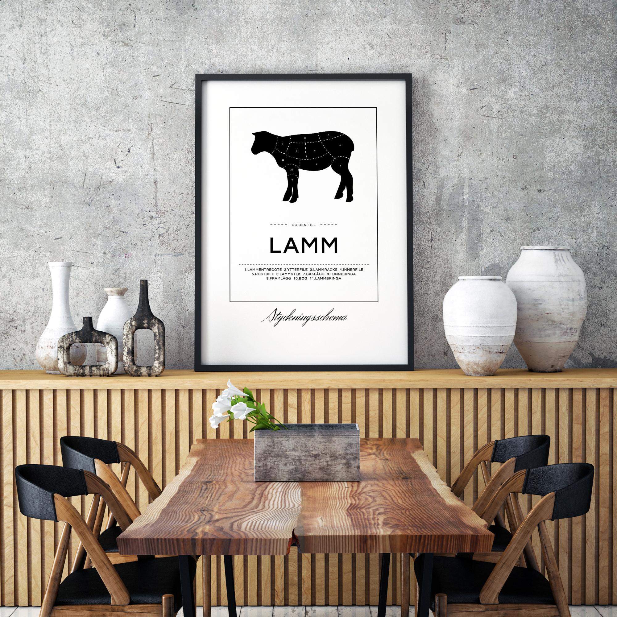 Lerne, wo du alle Delikatessen vom Lamm mit diesem schicken poster an der Wand findest. Das poster zeigt ein schwarzes Lamm, das in Markierungen unterteilt ist, die zeigen, wo zum Beispiel Außenfilet, Lammracks und Schulter entnommen werden. Ergänzend zu dem Bild steht der Text "Der Leitfaden zum Lamm" zusammen mit einer ordentlichen Nummernliste über die verschiedenen Teile. Um den Text und das Bild verläuft ein dünnes Rechteck und unter dem Rechteck befindet sich ein print mit dem Text "Zerlegungsschema".
