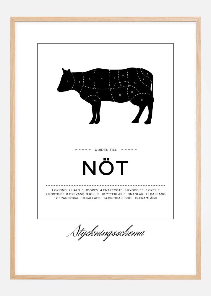 Ein Zerlegungsschema ist nicht nur etwas für professionelle Fleischer! Dieses stilvolle Plakat zeigt ein Motiv mit einer schwarzen Kuh, die in Markierungen unterteilt ist, die zeigen, wo beispielsweise Roastbeef, Roulade und Braten herkommen. Unter dem Bild steht der Text "Der Guide zum Rind" zusammen mit einer ordentlichen Nummernliste der verschiedenen Teile. Um das Motiv verläuft ein dünner Rechteck und unter dem Rechteck befindet sich ein Druck mit dem Text "Zerlegungsschema". Das schwarz-weiße Design sieht hervorragend aus mit einem Silberrahmen oder einem Rahmen in Ihrer Lieblingsfarbe. Das Poster ist in mehreren verschiedenen Formaten erhältlich, so dass Sie leicht eines finden, das genau zu Ihrer Küche passt.