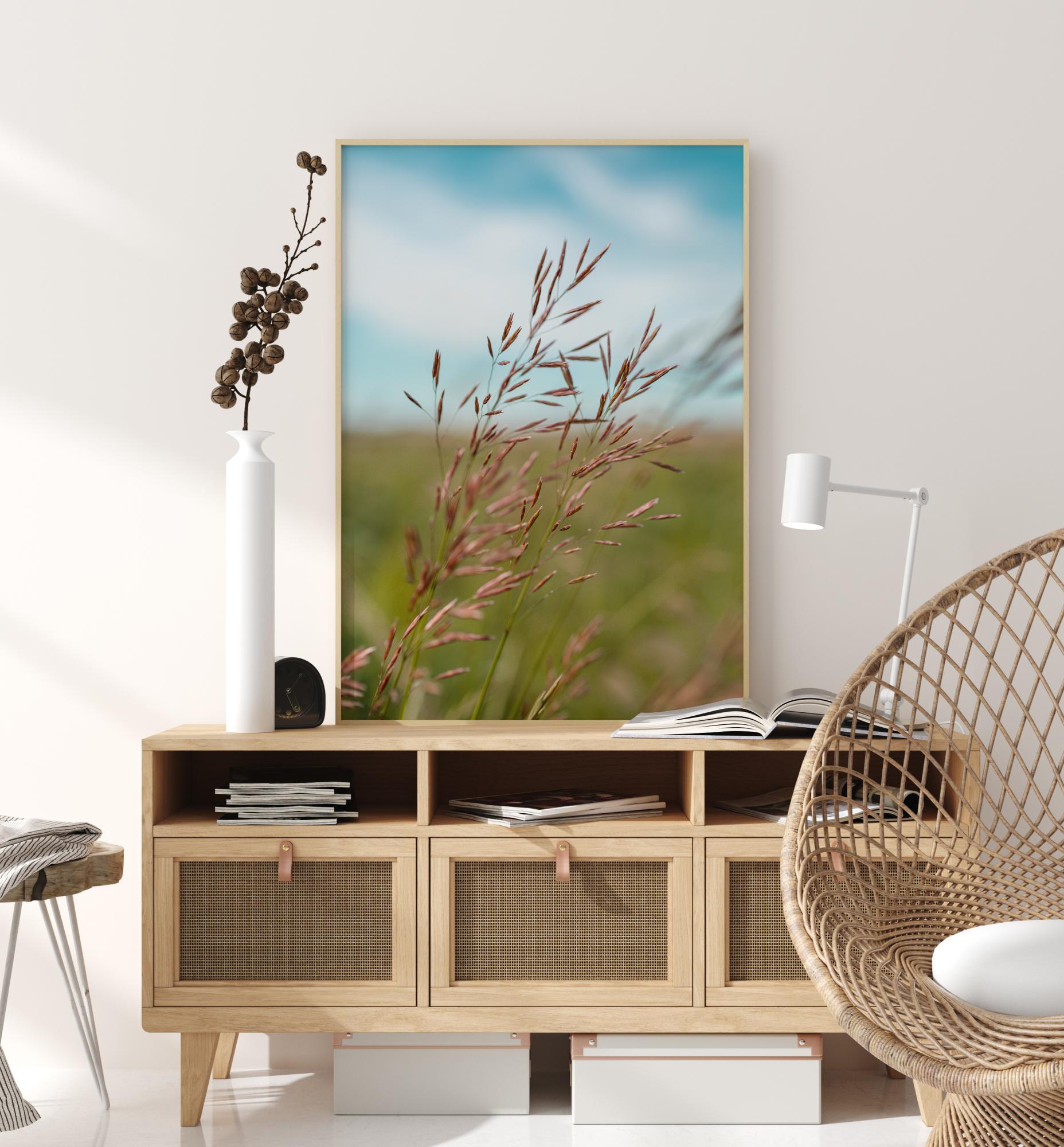 Ein helles Poster eines grünen Feldes mit einer Nahaufnahme von Grassamen an einem langen Stängel. Das zarte Rosarot der Grassamen wird durch das helle Grün des Feldes im Hintergrund hervorgehoben. Ein blauer Himmel mit weichen weißen Wolken macht dies zu einem super sommerlichen Tag. Diese fröhliche Szene wird jeden Raum erhellen.