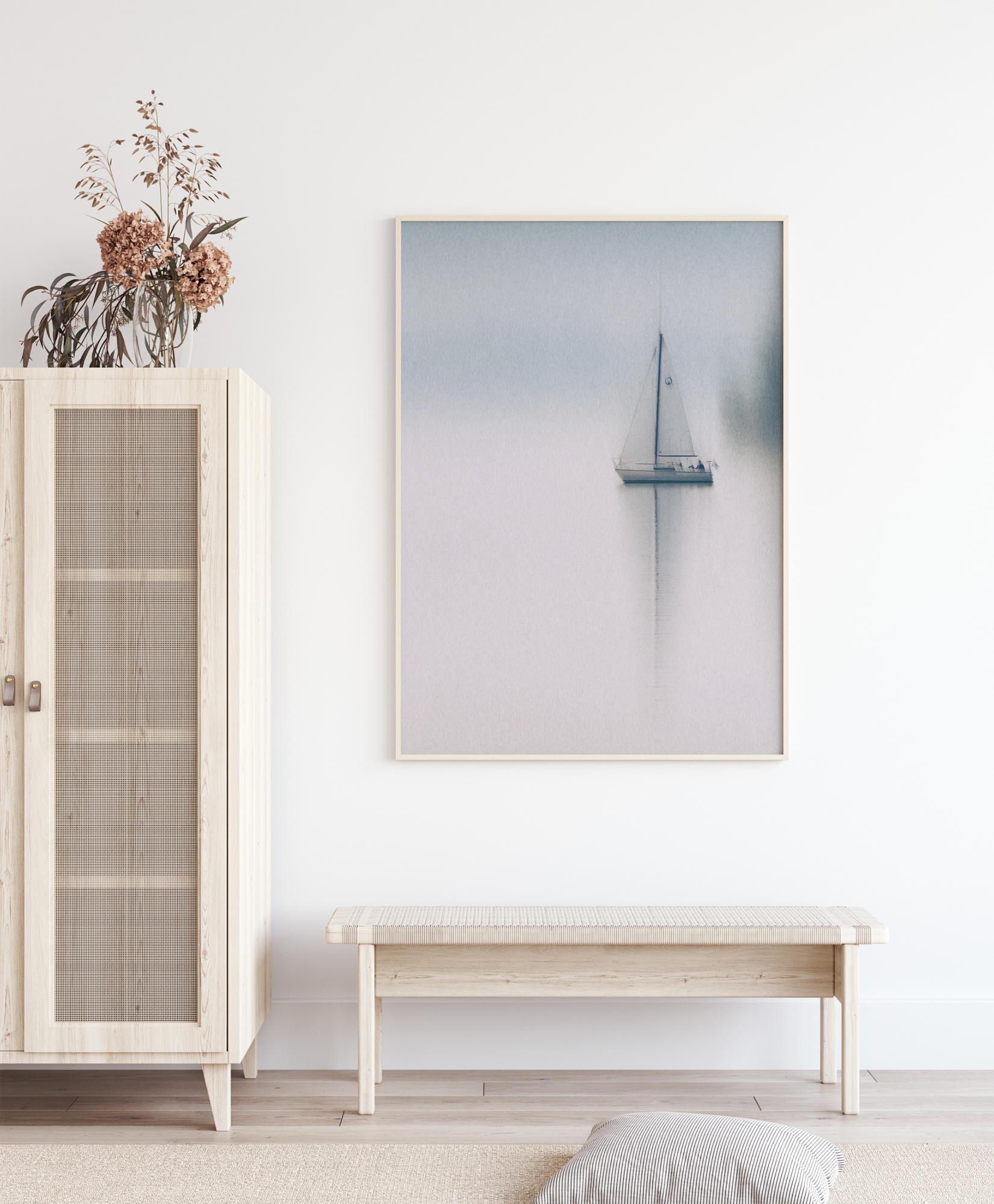 Ein beruhigendes Poster einer Jacht inmitten eines blassweißen Sees. Das Bild ist weich, mit unscharfen Rändern für alle Gestalten. Mit langgestrecktem Segel gleitet das Bootes auf dem Wasser in den blassblauen und grauen Dunst eines frühen Sonntagmorgens.