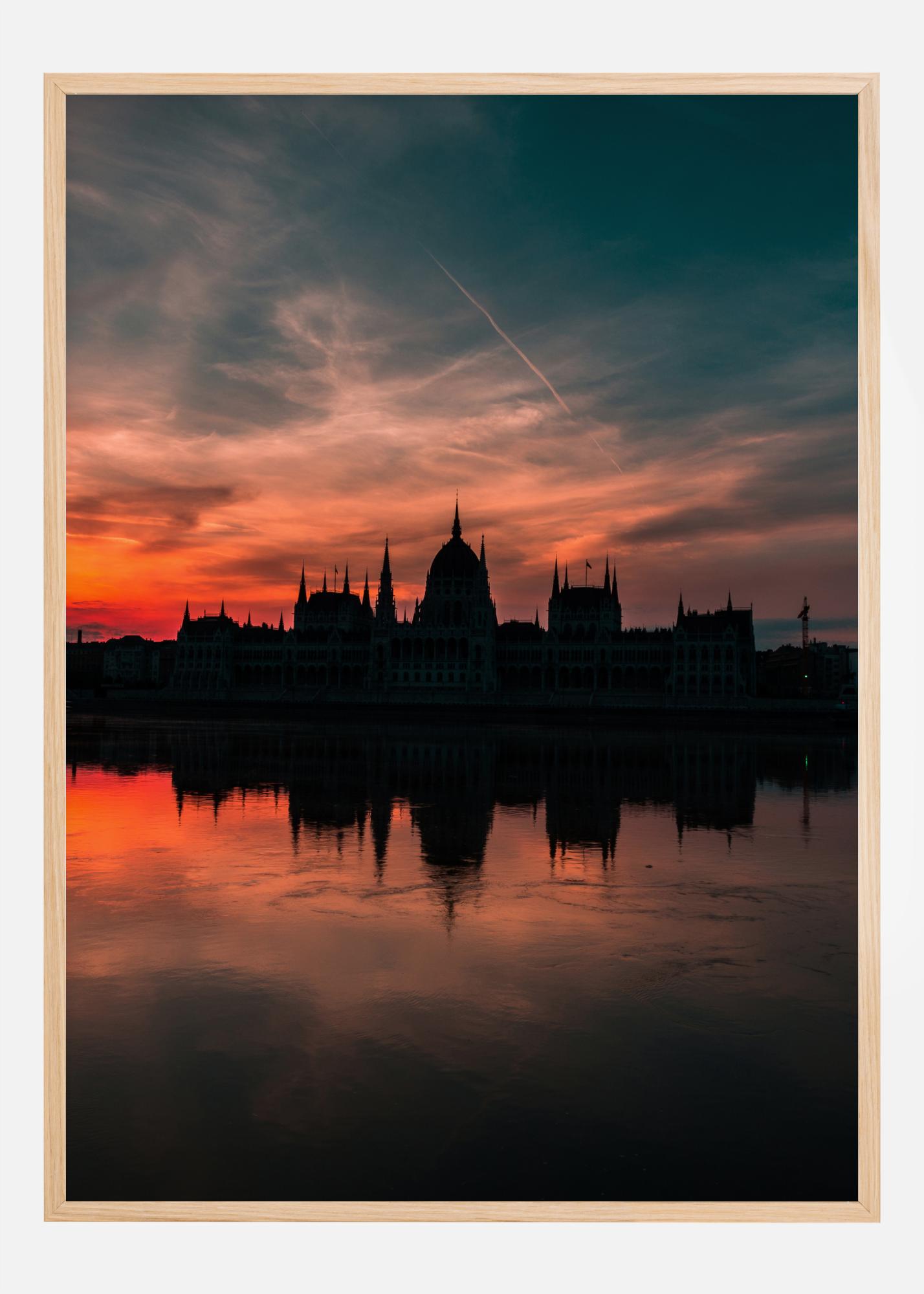 Ein Sonnenuntergangsposter einer Stadt mit Blick auf eine große Wasserfläche. Die starke schwarze Silhouette der Türme der Stadt spiegelt sich im Wasser. Dahinter erhellt ein leuchtend roter Sonnenuntergang den Himmel und wirft ein dramatisches Licht auf das Wasser und die Stadt.