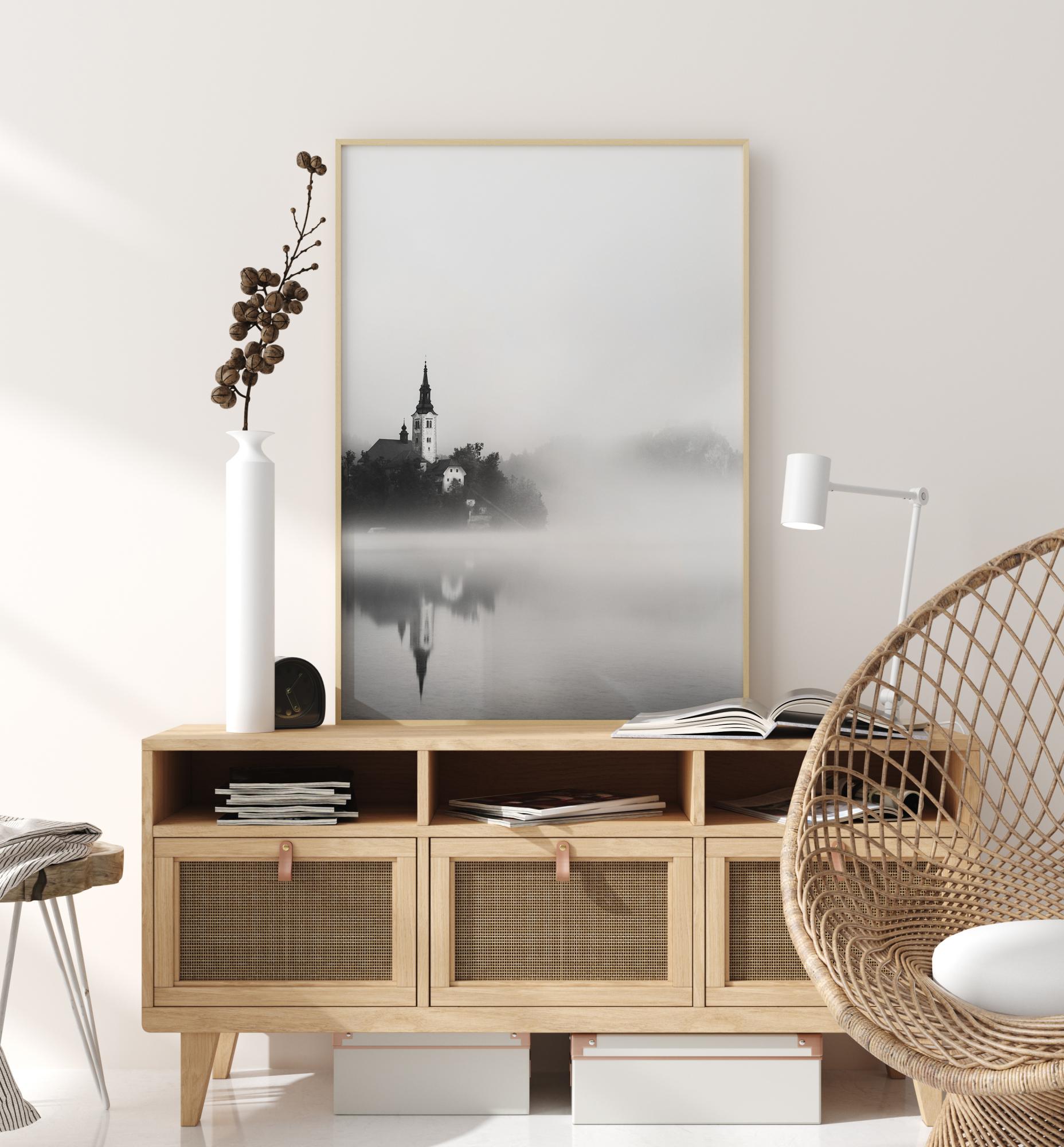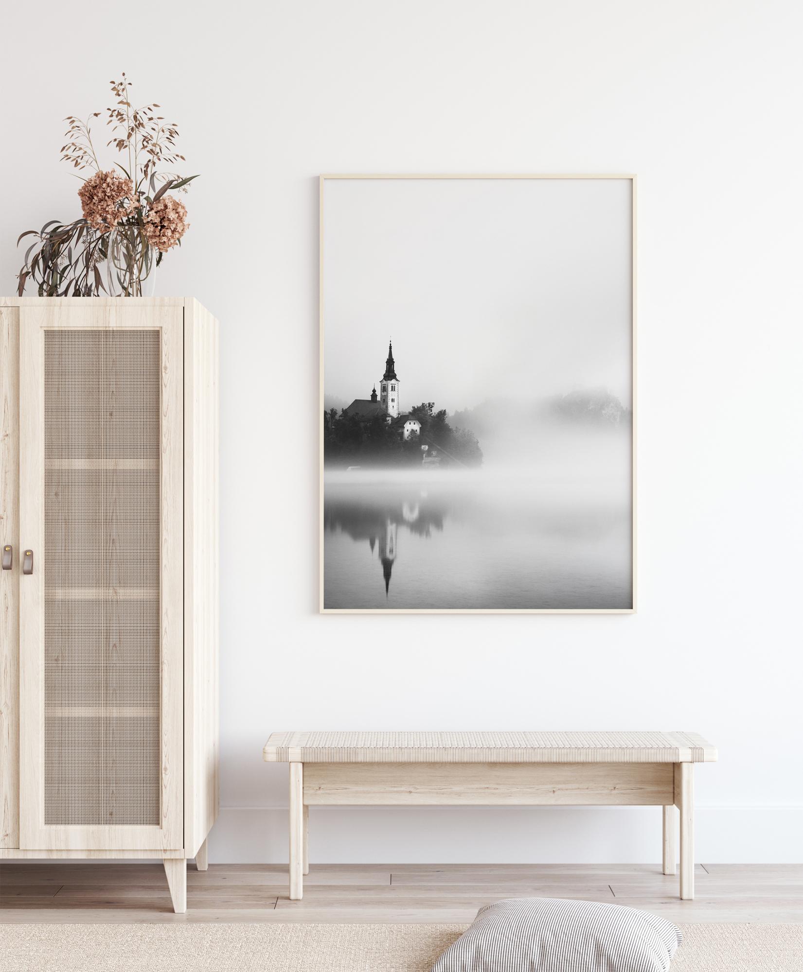 Ein religiöses Poster mit einer weißen Kirche an einem See. Dieses Schwarz-Weiß-Foto hat etwas Geheimnisvolles an sich. Der See ist in Nebel gehüllt, als die Sonne aufgeht. Die Kirche taucht aus dem Nebel auf, mit scharfen Linien, die sich von der Sanftheit des Nebels abheben.