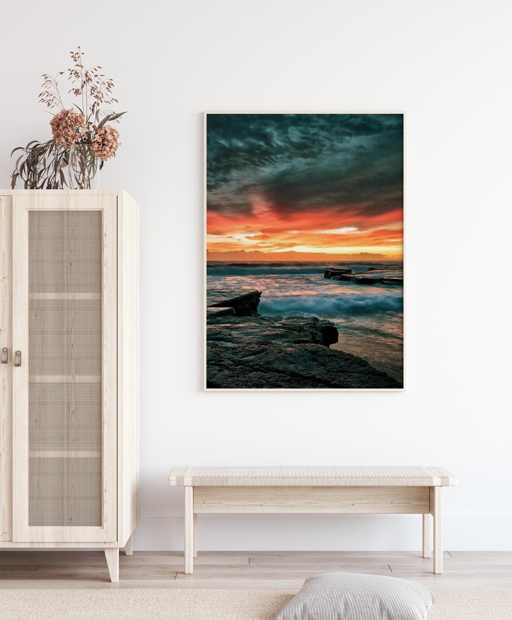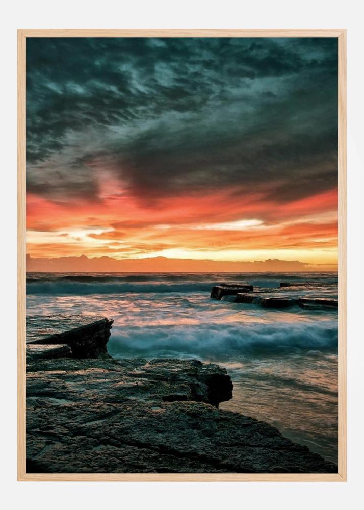 Ein episches Poster eines Sonnenuntergangs über dem Wasser. Die Wellen des Meeres schlagen gegen das flache, felsige Ufer. Dunkle Wolken befinden sich direkt über einem leuchtend roten Sonnenuntergang tief am Horizont und schaffen ein dramatisches und beeindruckendes Bild, das Ihre Aufmerksamkeit auf sich zieht.