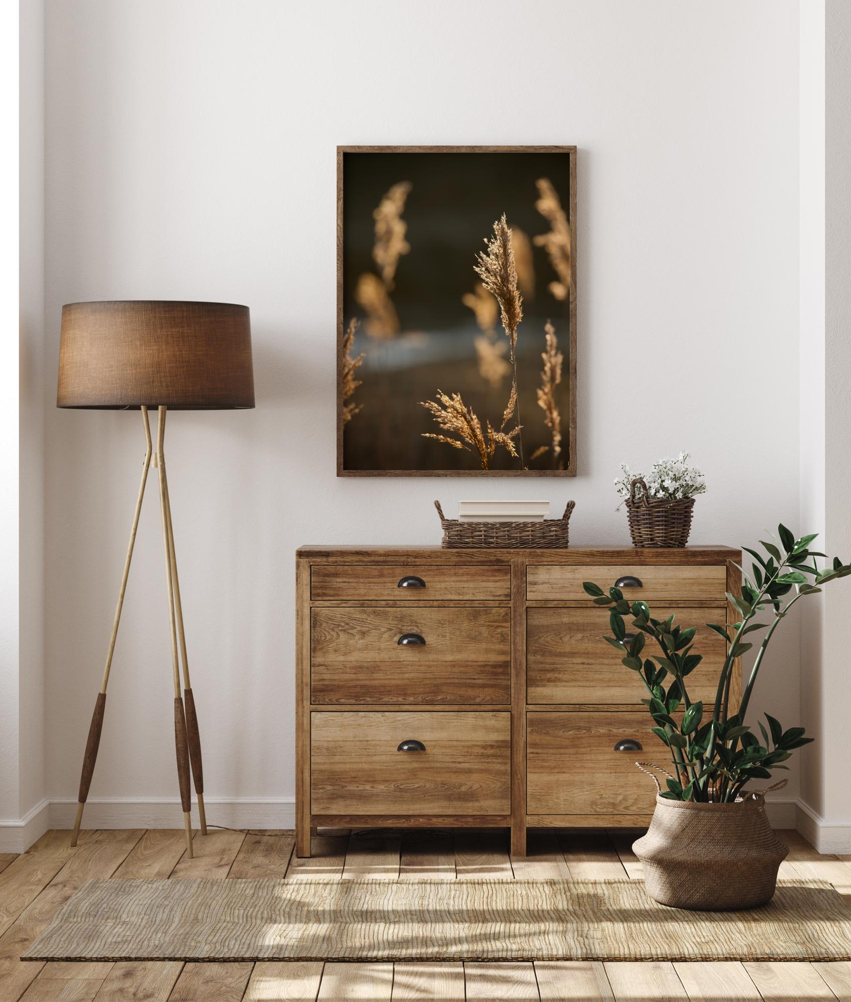 Ein sommerliches Poster von Sonnenschein auf einer Wiese. Nahaufnahmen von Grasähren, die sich in einer Sommerbrise wiegen. Sie fangen das goldene Licht der Sonne ein, das auch auf dem entfernten Fluss glitzert. Genießen Sie dieses stimmungsvolle und weiche Bild, das den Sommer nach Hause bringt, wenn Sie es aufhängen.
