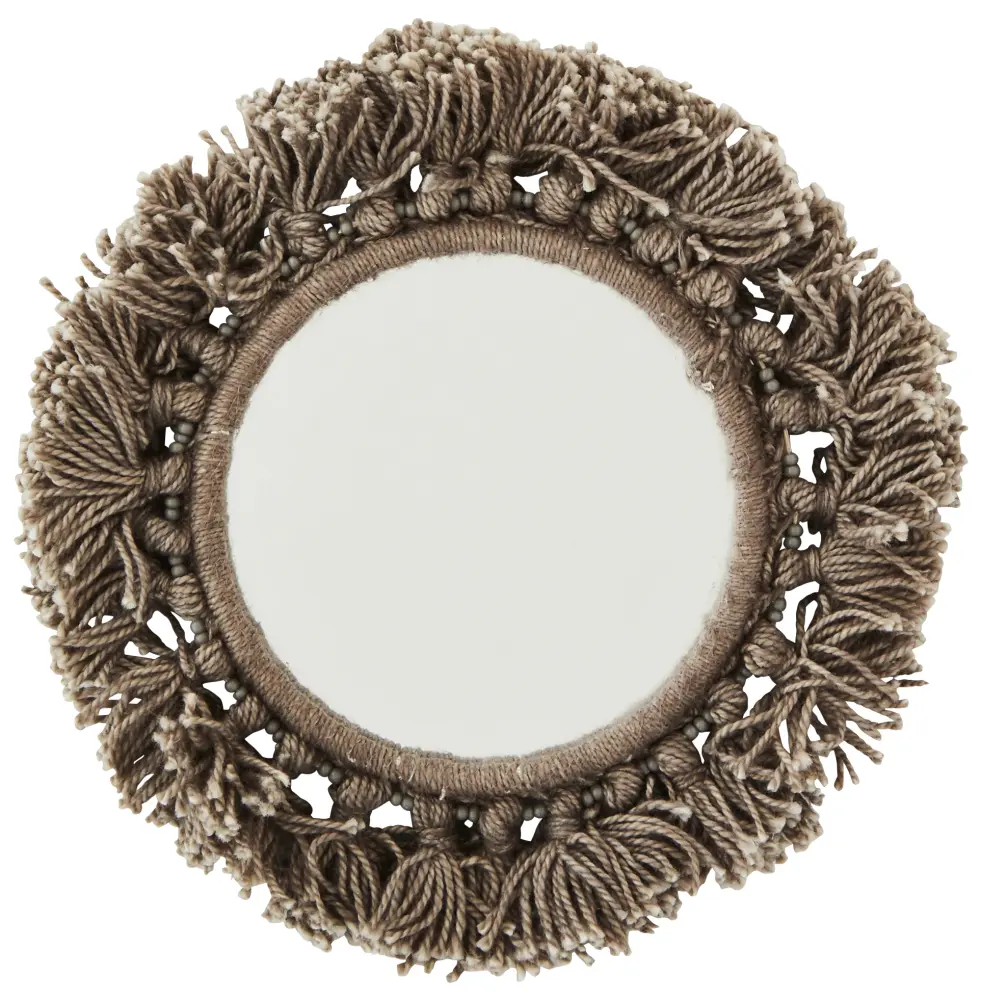 Dieser Taschenspiegel von Madam Stoltz ist praktisch und charakterstark zugleich. Dank seiner kompakten Größe mit einem Durchmesser von nur 11 cm lässt er sich hervorragend in der Hand- oder Jackentasche verstauen. Der Spiegel besteht aus Glas und Baumwolle und hat dekorative Quasten, die seine Kanten zieren. Er ist in verschiedenen Farben erhältlich, diese Variante hat eine natürliche graue Farbe.