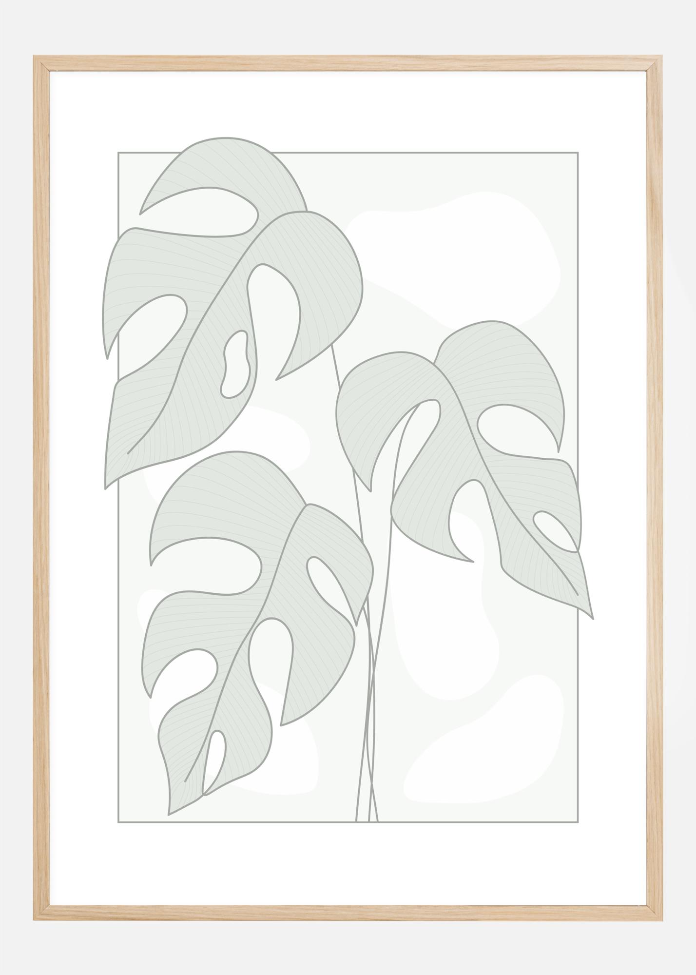 Ein einfaches Poster mit illustrativen Blättern einer Käsepflanze. Drei große Blätter füllen das Bild, jedes in einem weichen Grauton. Hauchdünne Linien bilden die Stiele, während diese eleganten Blätter mit Löchern in diesem Bild nach unten hängen. Hängen Sie das Bild an eine zartgrüne Wand, um ein natürliches Ambiente zu schaffen, und halten Sie es dezent.