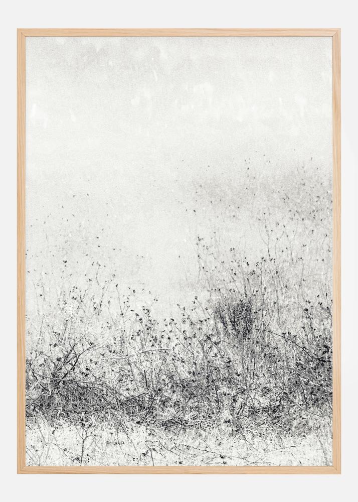 Ein künstlerisches Poster von endlosen Grasfeldern in Schwarz-Weiß. Die kratzigen Punkte und Linien lassen es wie ein verworrenes Dickicht aus Gras und Brombeeren aussehen. Es erinnert an einen Jackson Pollack mit seinen seltsamen Kritzeleien auf der Seite. Die Linien heben sich scharf und hell von einem weißen Hintergrund ab.