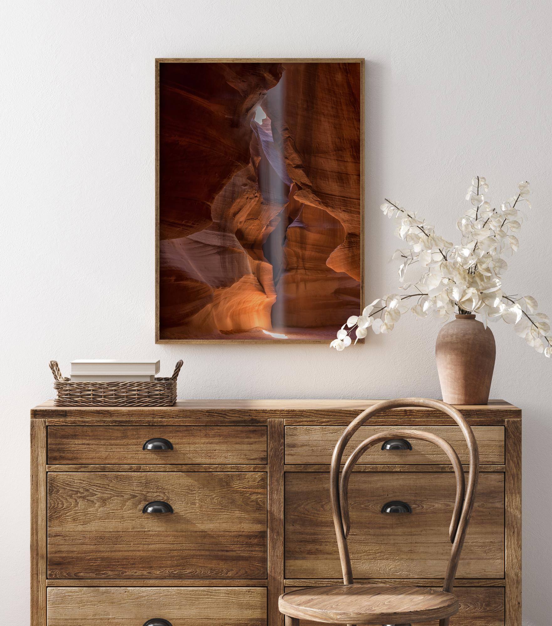 Ein magisches Poster eines Lichtstrahls, der sich durch rote Felsen bewegt. Die weichen Kurven der roten Felsen erzeugen ein warmes Licht. Der einzelne Lichtstrahl verleiht diesem geschlossenen Raum eine magische Atmosphäre und beleuchtet die weichen Felsen zusätzlich. Holen Sie sich dieses Stück nach Hause, um Ihr Zuhause mit ein wenig Drama zu bereichern.