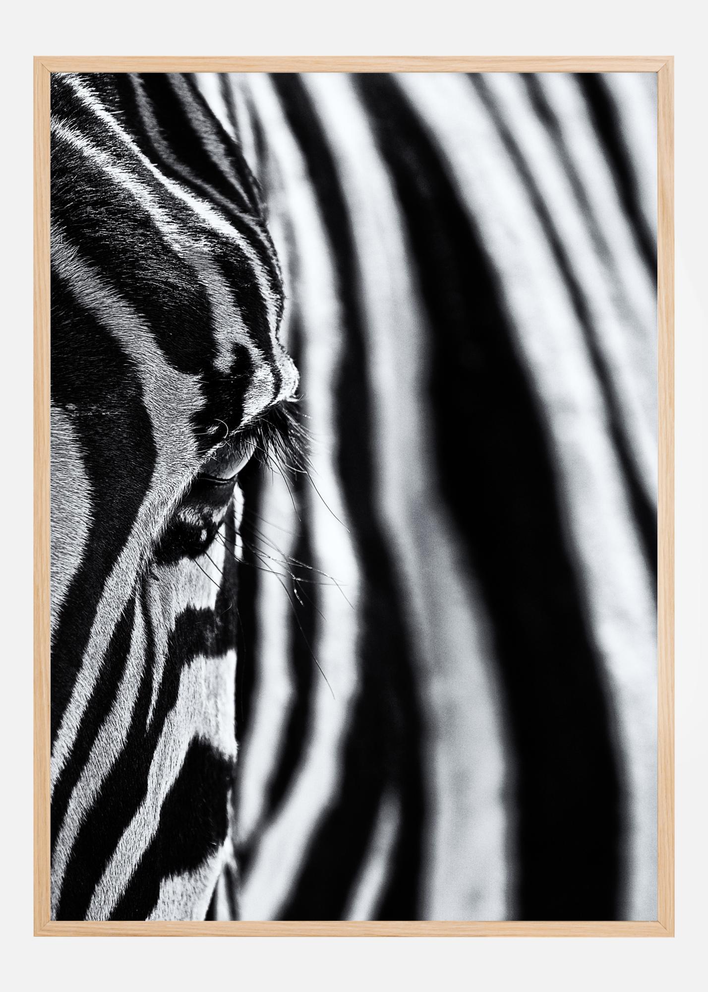 Eine Nahaufnahme der Gesichtsseite eines Zebras. Die dicken schwarzen und weißen Streifen bilden atemberaubende geometrische Formen, die das Auge anziehen. Das Auge des Zebras und seine Wimpern verleihen dem Bild eine etwas weichere Note. Fügen Sie dieses Bild einer weißen Wand ein, um den starken Schwarz-Weiß-Effekt zu erhalten.