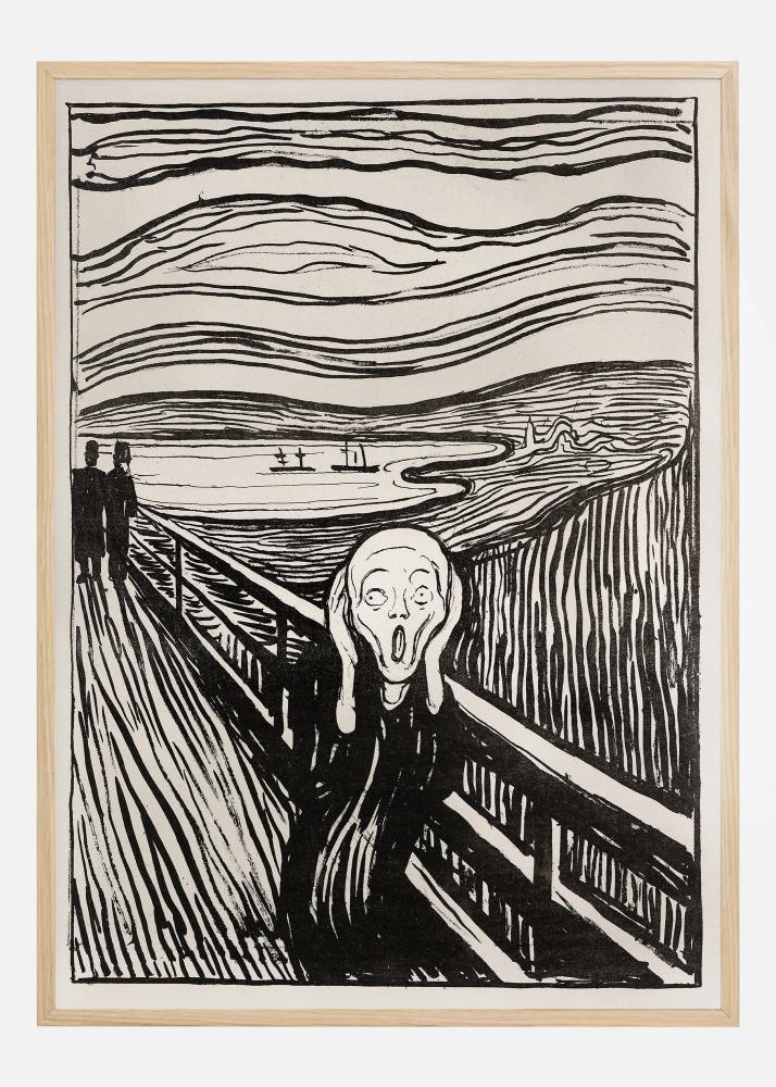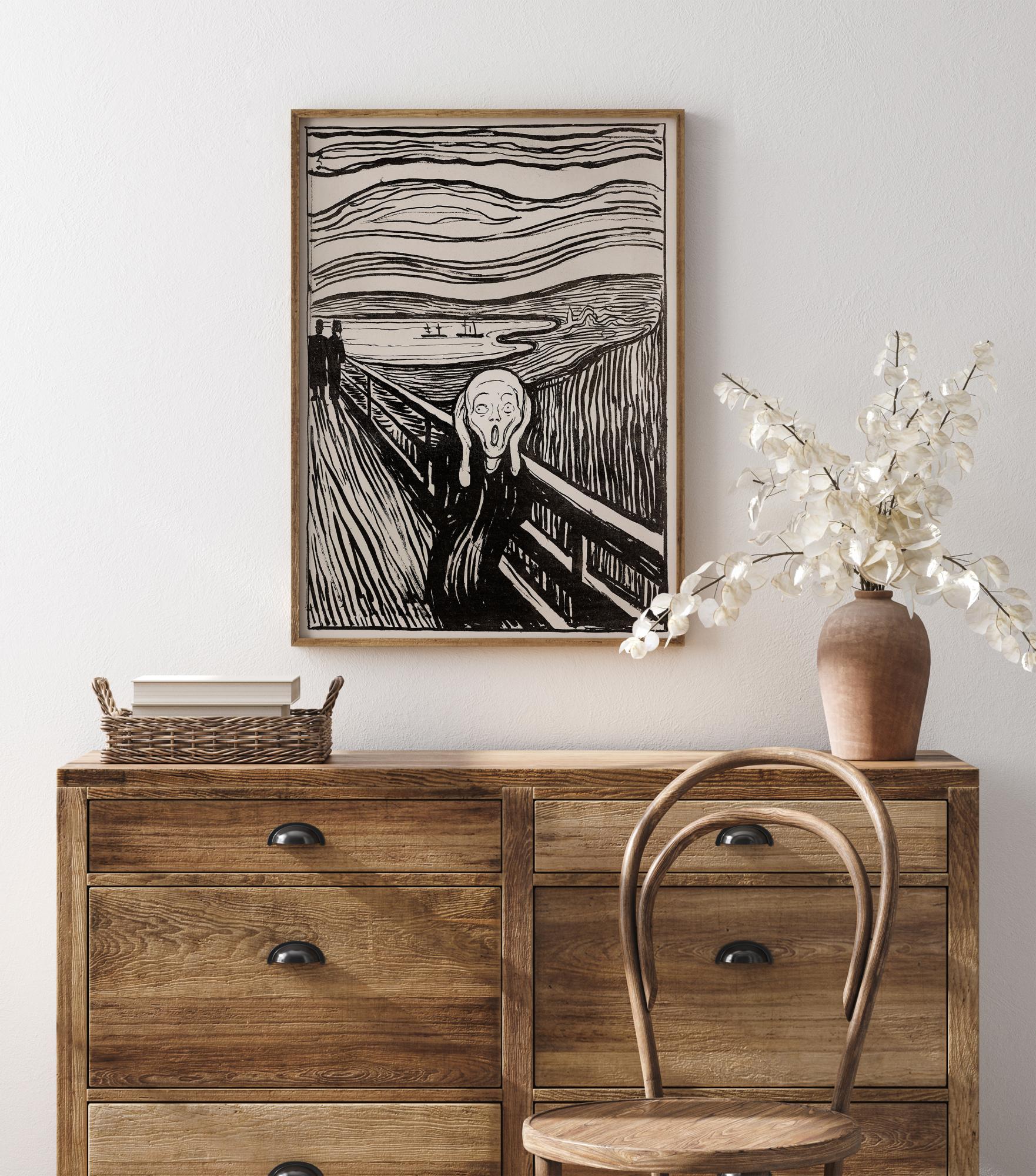Ein abstraktes expressionistisches Poster von Edvard Munchs Der Schrei in Schwarz und Weiß. Dieses ikonische und sofort erkennbare Schwarz-Weiß-Poster konzentriert sich auf das schreiende weiße Gesicht der Person auf der Brücke. Zeigen Sie Ihr Wissen über Kunst mit diesem klassischen Bild an einer farbigen Wand zu Hause.