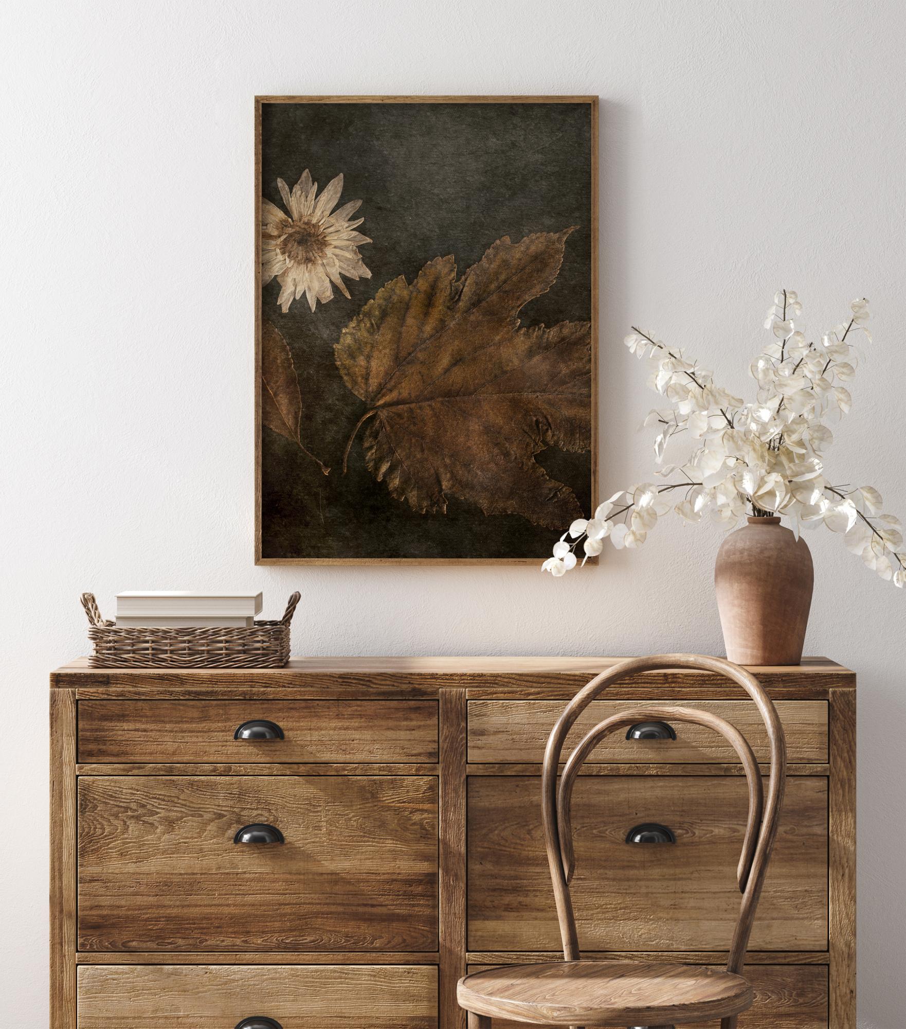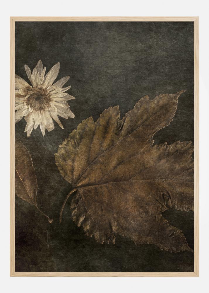 Ein florales Poster mit einer einzelnen Blume und zwei Blättern. Die weiße, sternförmige Blüte hebt sich deutlich vom dunkelgrauen Hintergrund ab. Sie wird von zwei braunen, herbstlichen Blättern flankiert, von denen das eine einfach oval und das andere komplizierter in Form einer Platane ist. Schauen Sie genau hin, um die Details in den Blättern und Blütenblättern dieses atemberaubenden botanischen Drucks aufzunehmen.