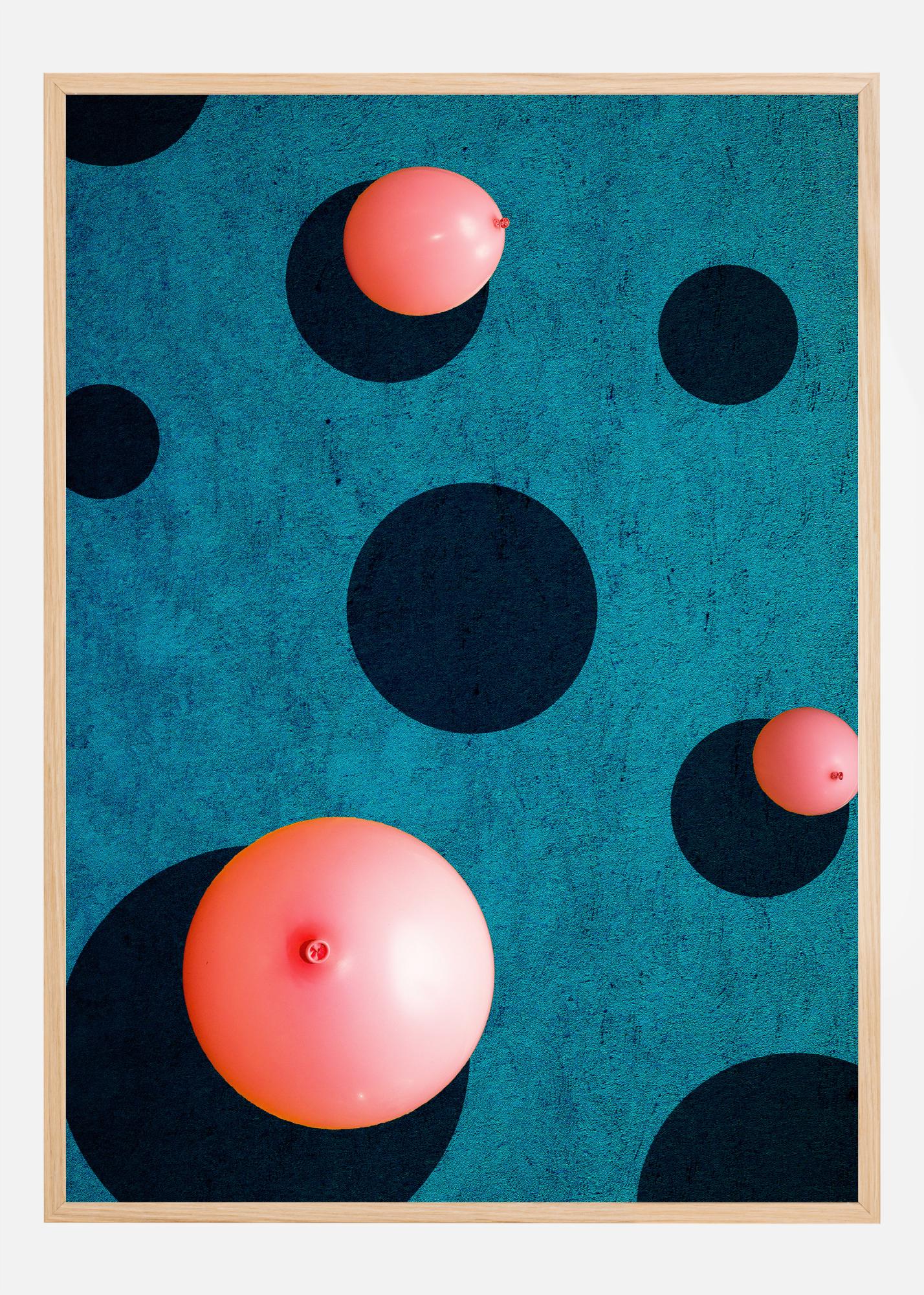 Ein lebendiges Poster mit drei orangefarbenen Luftballons vor blauem Hintergrund. Jeder Ballon wirft einen dunklen Schatten auf den Hintergrund. Aber es gibt auch weitere dunkelblaue Schattenkreise. Die anderen Ballons müssen in diesem seltsamen, aber faszinierenden, mit Punkten gefüllten Poster irgendwo höher schweben.
