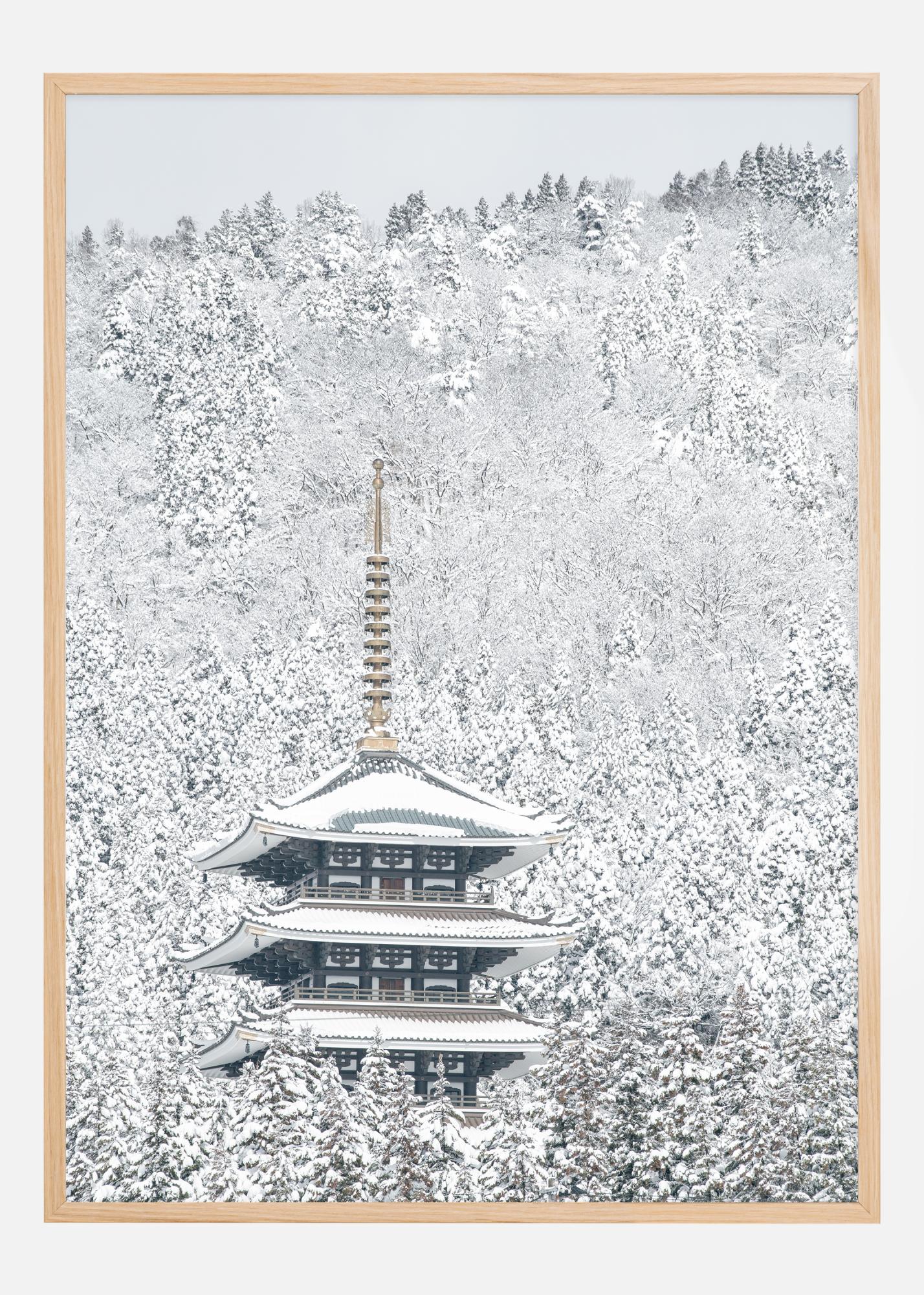 Dieses stimmungsvolle Poster ruft das friedliche Gefühl einer winterlichen Landschaft hervor, in der ein traditionelles ostasiatisches Pagoden-Gebäude majestätisch umgeben von einem Meer aus schneebedeckten Bäumen steht. Der subtile Kontrast zwischen der zarten Architektur und den kraftvollen, üppigen Bäumen, die alle in eine dicke Schneeschicht gehüllt sind, schafft ein Bild von Stille und Abgeschiedenheit. Dieser Druck fängt perfekt die einsame Schönheit der winterlichen Natur ein, bei der die Weißtöne vom kräftigen, strahlenden Licht bis hin zu weichen, gedämpften Tönen variieren.