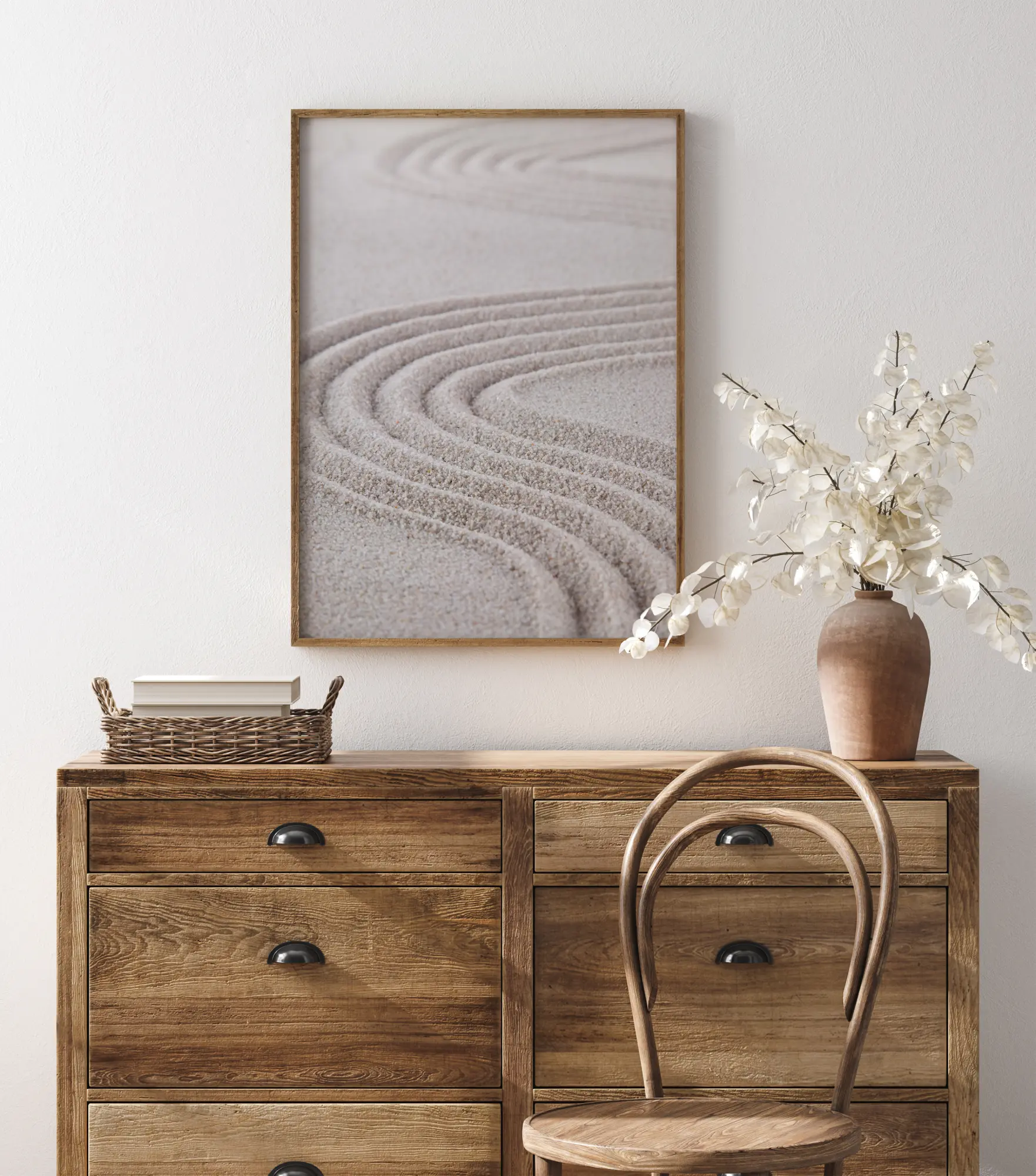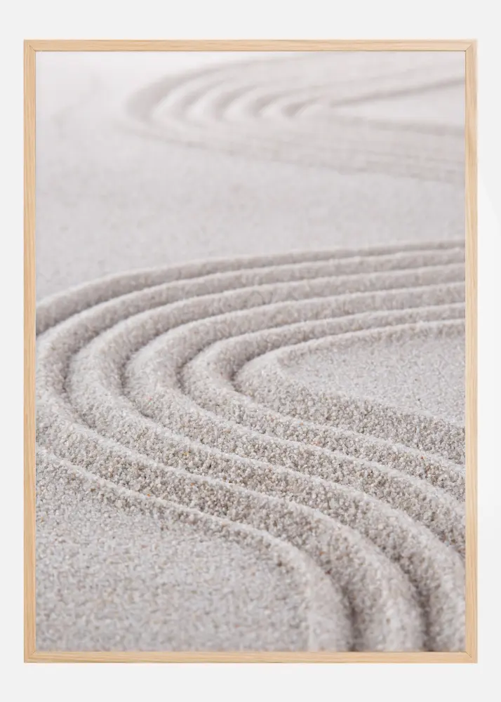 Ein Poster mit einer Nahaufnahme von Linien, die in den Sand gezeichnet wurden. Mit einer Harke wurden Strudel in den Sand gezeichnet, wobei die Linien gleichmäßig verteilt sind und tiefe Furchen bilden. Durch die Nahaufnahme können Sie die Körner in diesem lustigen Wirbelmuster sehen. Kombinieren Sie es mit einer beigen Wand, um die sandige Farbe ins Bild zu bringen.