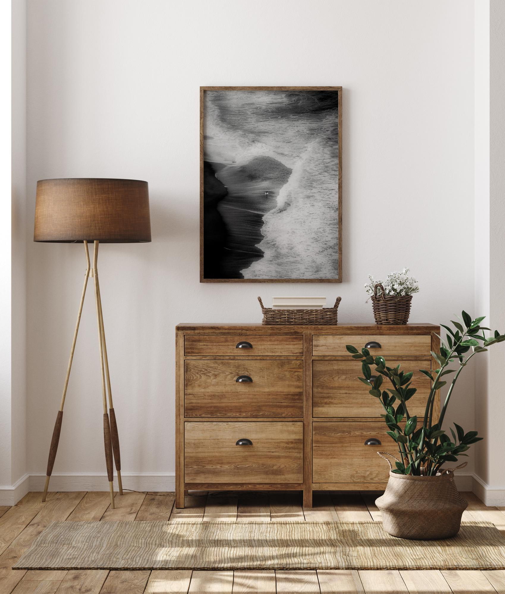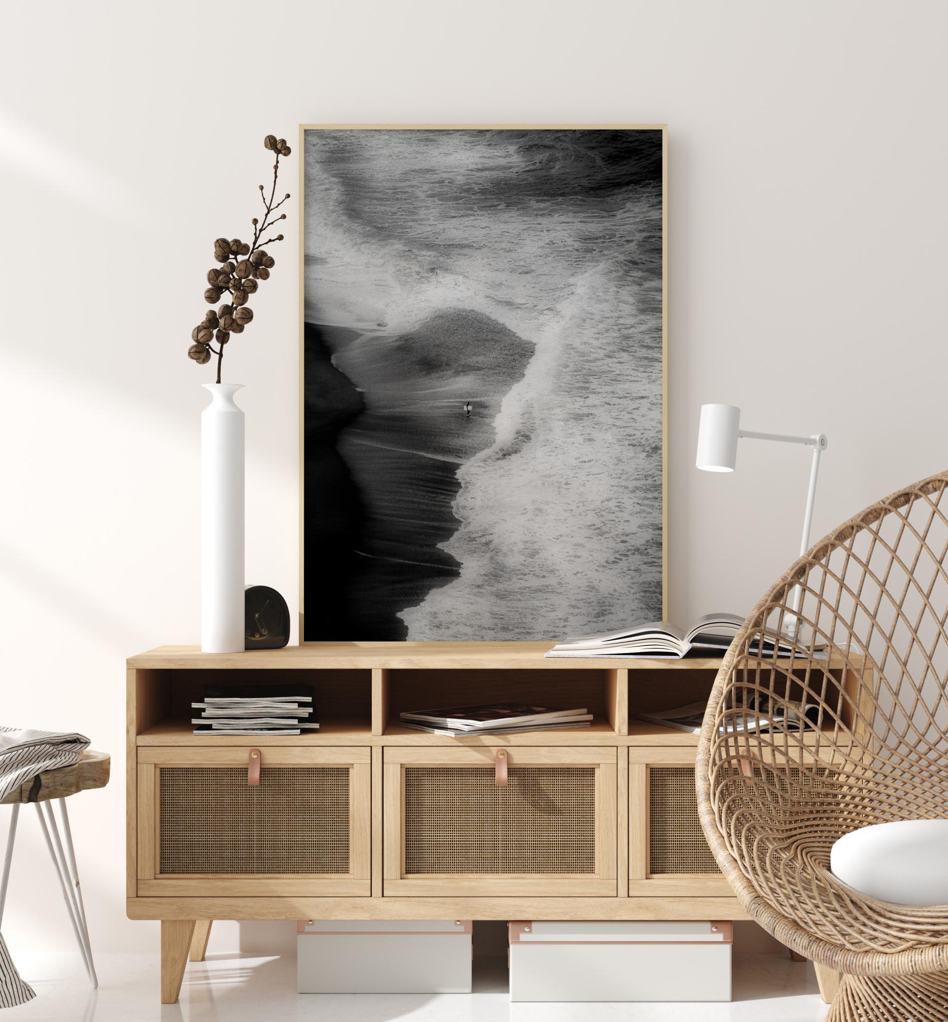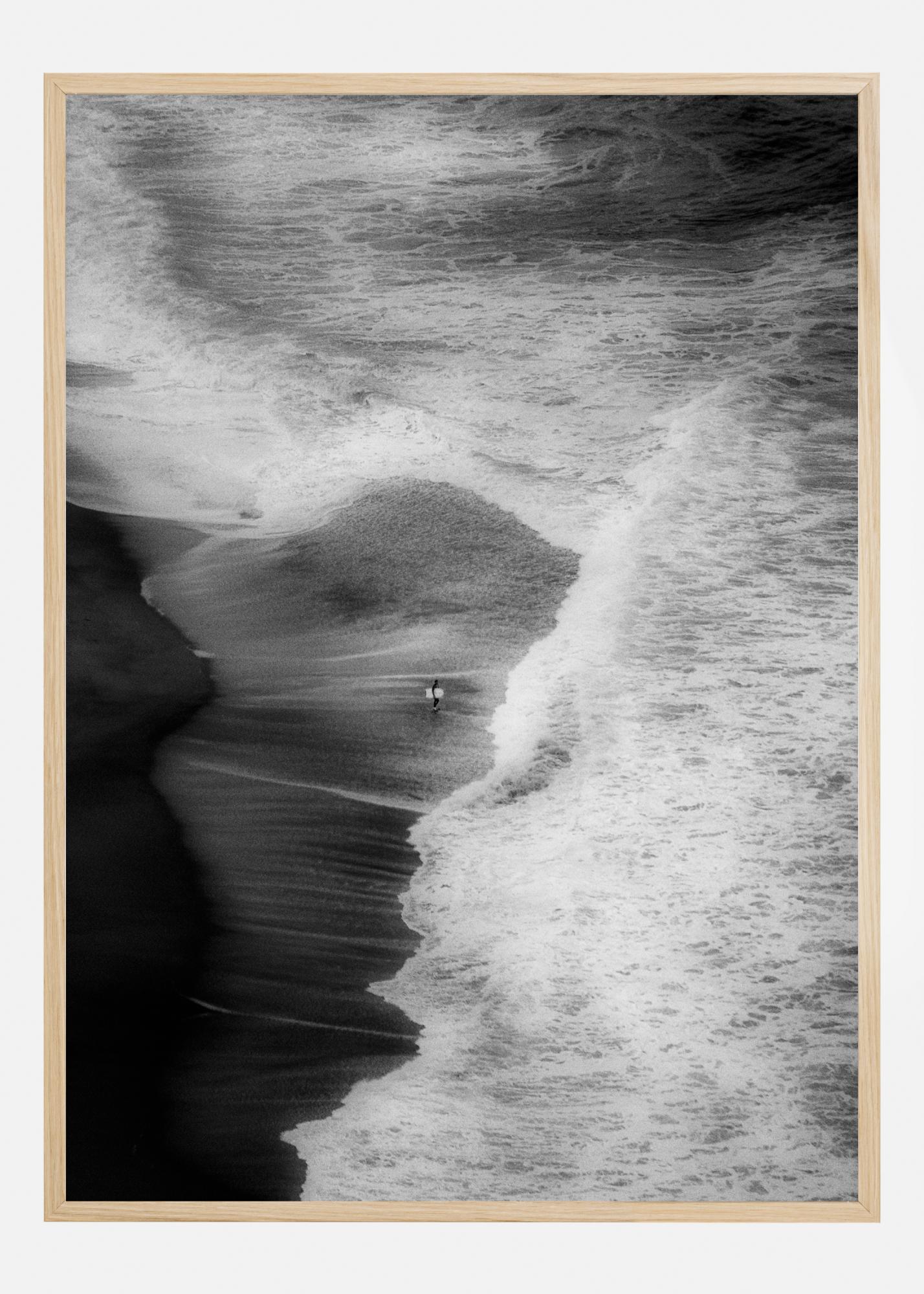 Ein Luftbildposter von einem Strand und der Brandung. Dieses abstrakte Bild zeigt die Großartigkeit der Natur, wenn die Wellen den Strand erreichen - der einsame Surfer bildet den Fokuspunkt des Bildes.