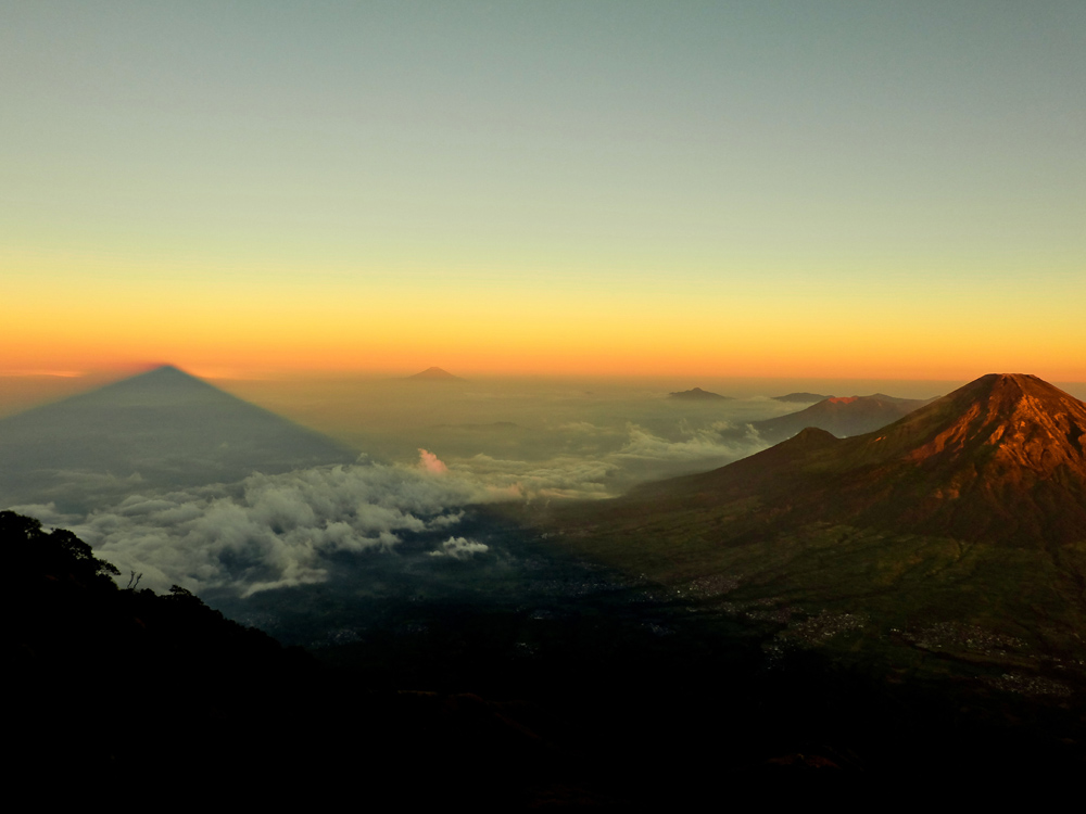 Druck mit einer großartigen Aussicht von oberhalb der Wolken über spitze Berge beim Sonnenaufgang. Die gelborangen Töne in der Skyline und der dunkle Vordergrund verleihen dem Bild eine dramatische Ader, die es zu einem Blickfang macht. Das Bild passt mit seiner stilreinen Bildsprache in jeden Einrichtungsstil, kombiniere es mit einem Rahmen, der die Farben im Bild hervorhebt.