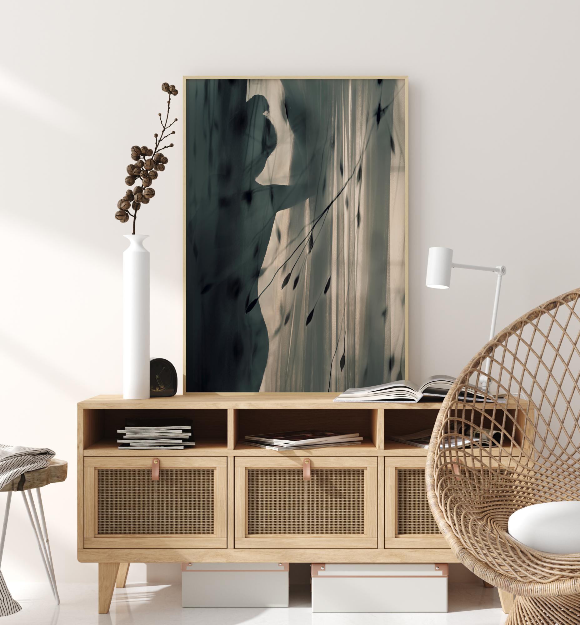 Ein Porträtposter, das die Figur einer Person zeigt, die durch einen Vorhang nach draußen blickt. Der weiche, durchscheinende Stoff weht über das Bild, während sich die Silhouette der Person gegen den Fensterrahmen lehnt. Sanftes Licht von draußen beleuchtet die Szene gerade genug, um zu erkennen, was vor sich geht.