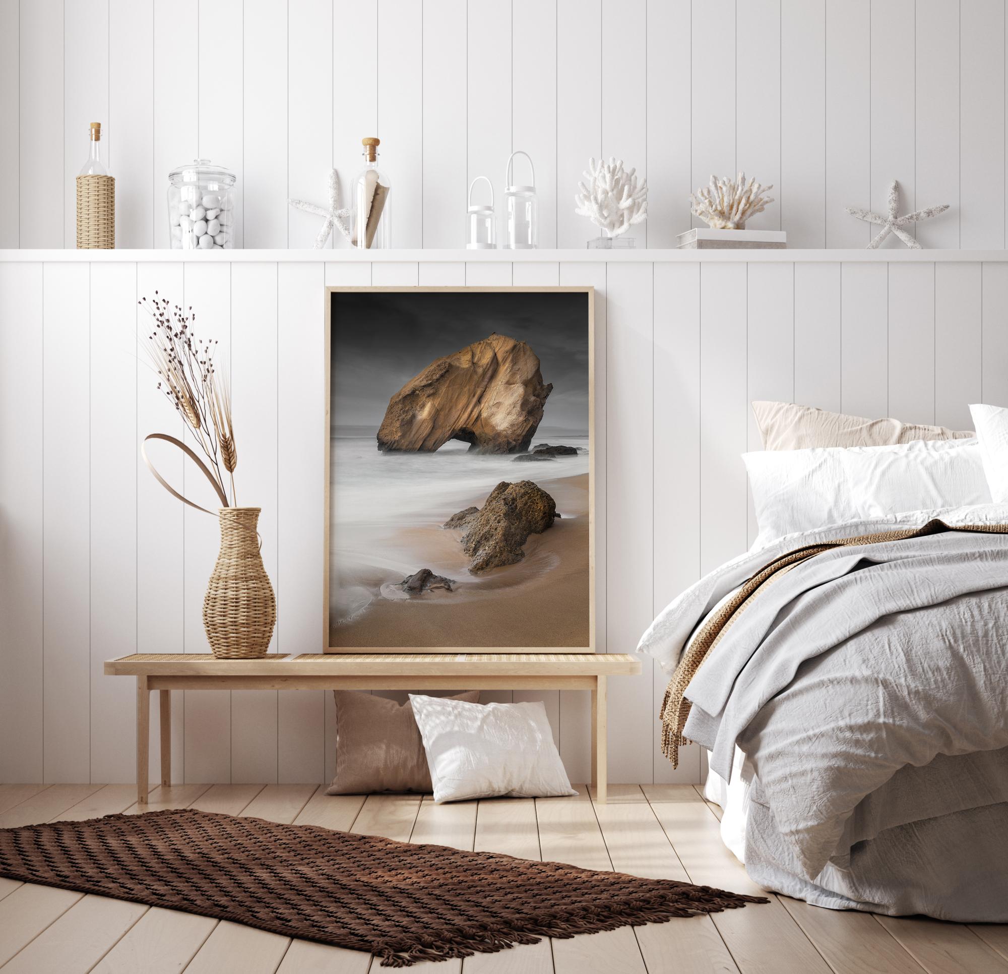 Ein dramatisches Poster von einem Strand und Felsen unter einem stürmischen Himmel. Die weißen Wellen des Ozeans wirbeln am Ufer um einen starken Sandfelsen in der Mitte des Meeres. Das weiche und unscharfe Bild mildert den möglichen Sturm ab und schafft eine ruhige Atmosphäre für Ihr Zuhause.