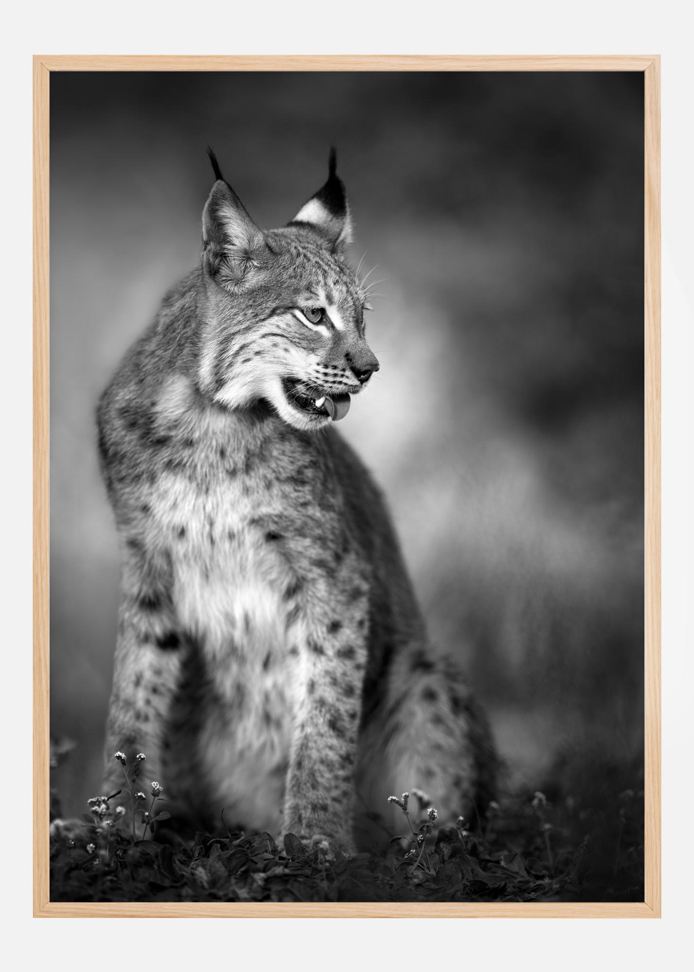 Ein Wildtierposter mit einem im Gras sitzenden Rotluchs. Die Katze blickt nach rechts, wo sie möglicherweise eine mögliche Beute beobachtet. Die hellen Flecken seines Fells und seine Ohrbüschel sind deutlich zu erkennen. Dieses Schwarz-Weiß-Poster passt gut zu einer grünen Wand, um ein natürliches Gefühl zu erzeugen.