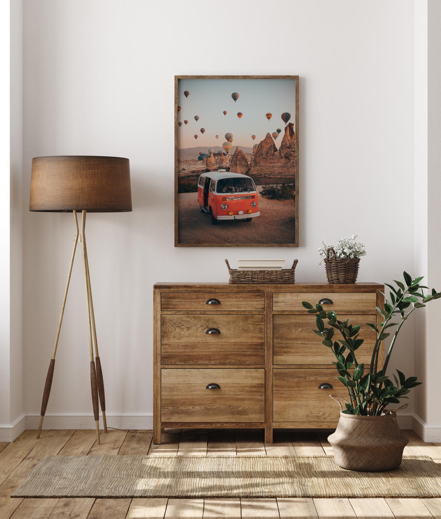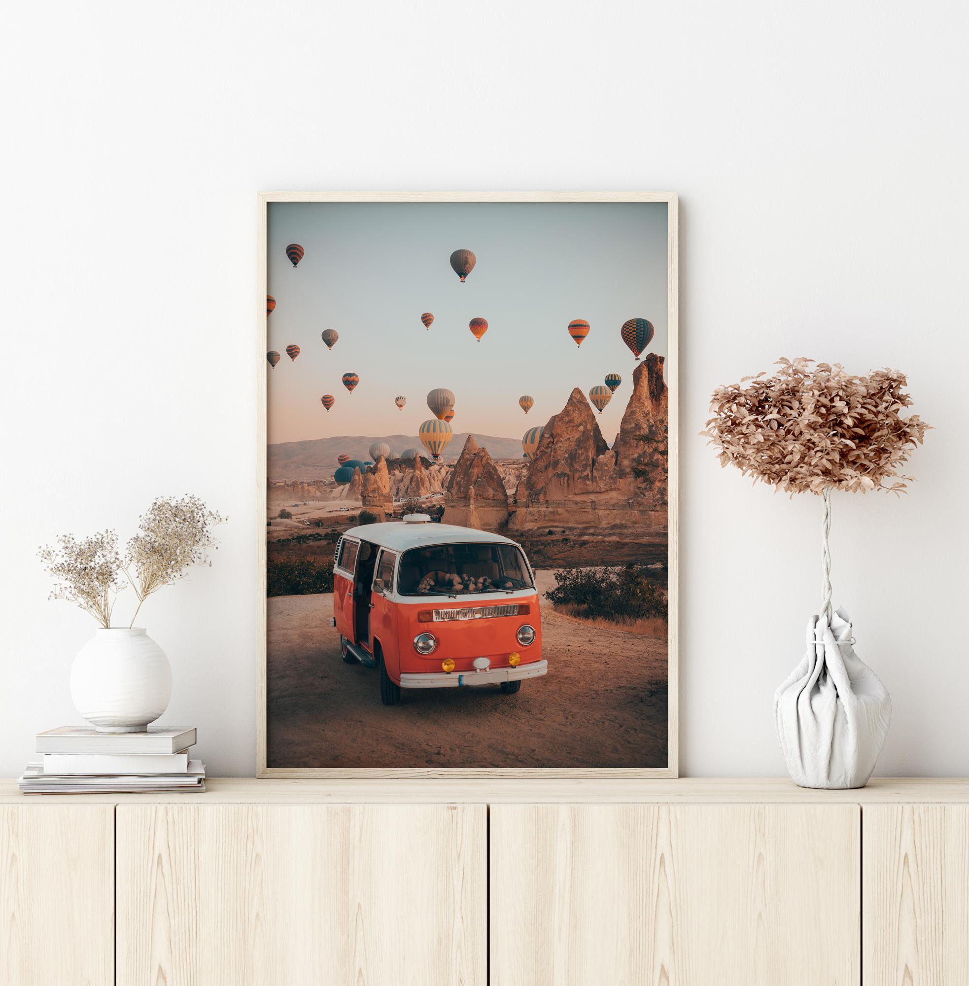 Ein Landschaftsposter mit interessanten Felsformationen und Heißluftballons, die über den Gipfel fliegen. Im Vordergrund steht ein orangefarbener VW-Bus mit offener Tür. Die farbenfrohen Ballons füllen den Himmel dahinter, während sie sich in den hellblauen Himmel erheben und eine magische Reise unternehmen.