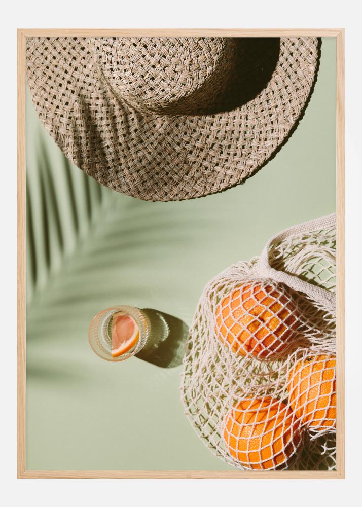 Die warmen Orangetöne und die natürlichen Nuancen des Hutes schaffen einen perfekten Kontrast zu dem sanften grünen Hintergrund und verleihen einen Eindruck von Leichtigkeit und natürlicher Schönheit. Dieses Poster ist nicht nur eine Dekoration; es ist eine Erinnerung an die einfachen Freuden des Lebens, wie frisches Obst zu genießen oder die Sonne auf der Haut zu spüren. Es ist das perfekte Einrichtungselement, um eine entspannte Atmosphäre in der Küche, auf der Terrasse oder an jedem beliebigen Ort zu schaffen, der einen sonnigen Touch benötigt.