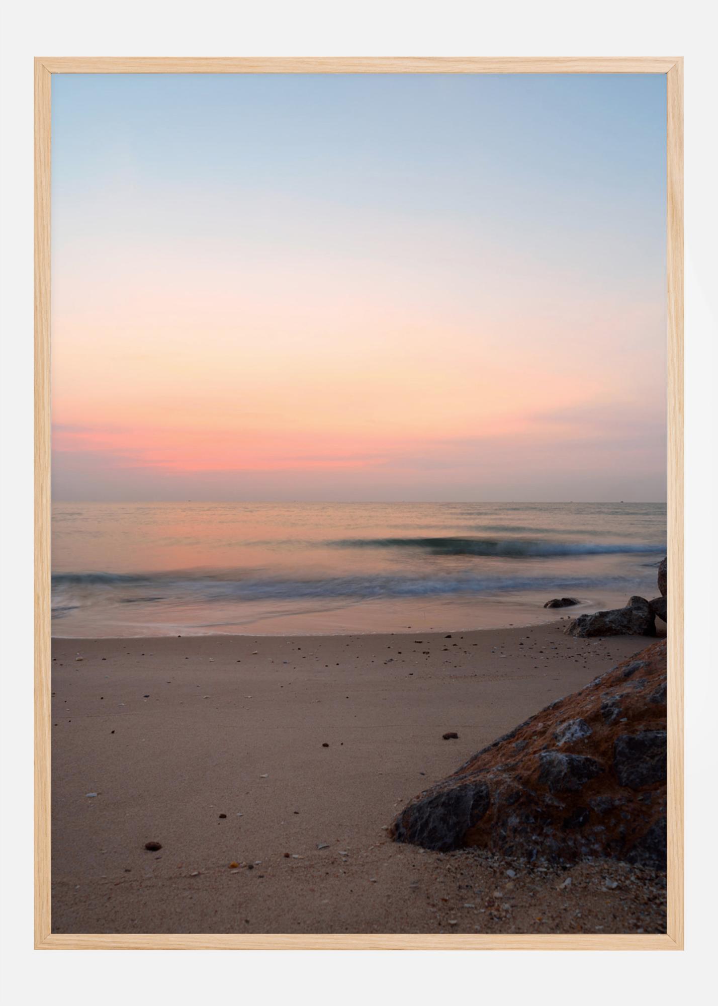 Ein Strandposter mit einer weiten Sandfläche und dem ruhigen Meer im Hintergrund. Ein sanfter Sonnenaufgang zeichnet sich am Horizont ab und wirft ein sanftes rosa und blaues Licht auf das Meer. Holen Sie sich die Urlaubsstimmung mit dieser ruhigen und beschaulichen Strandszene.