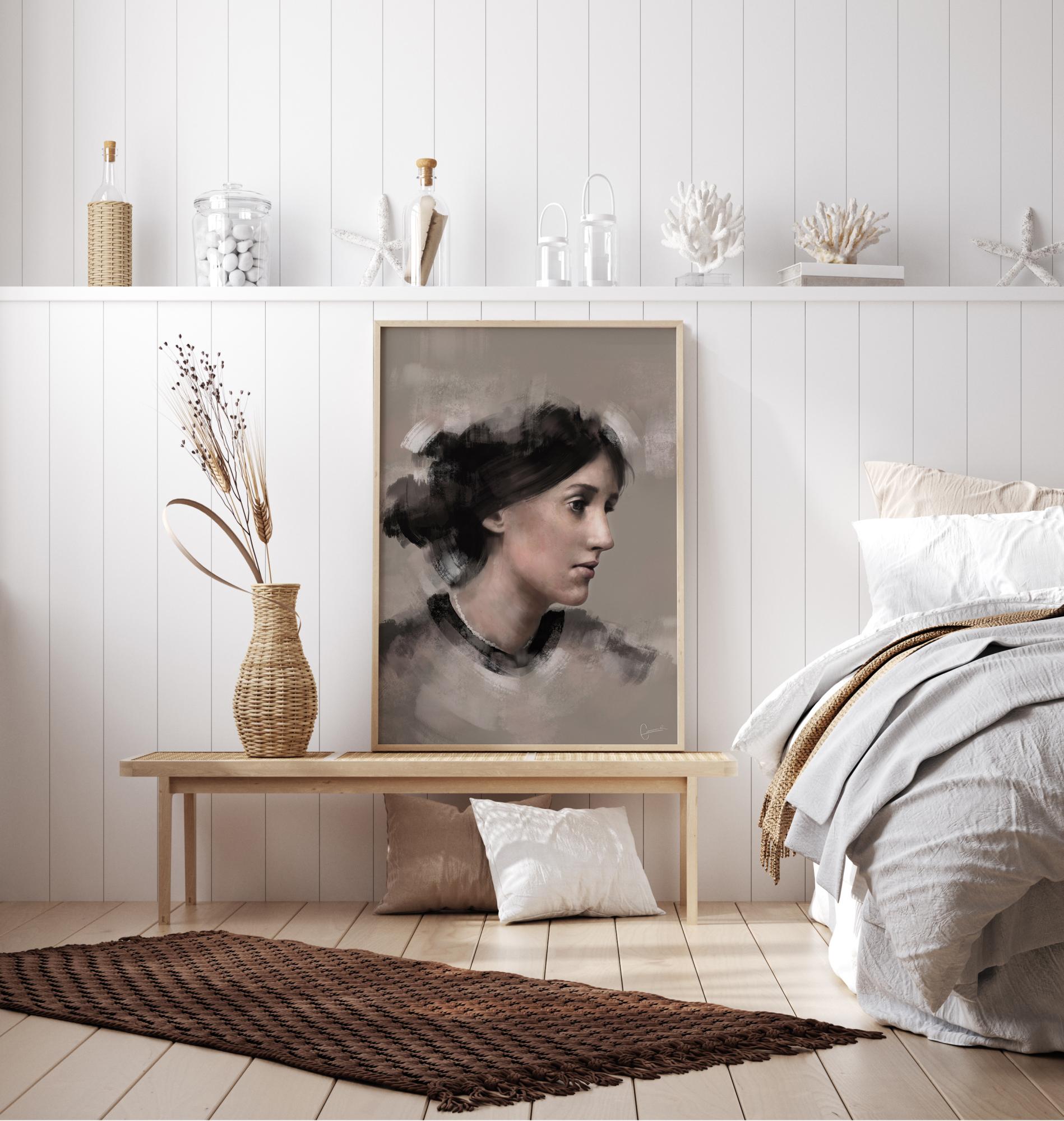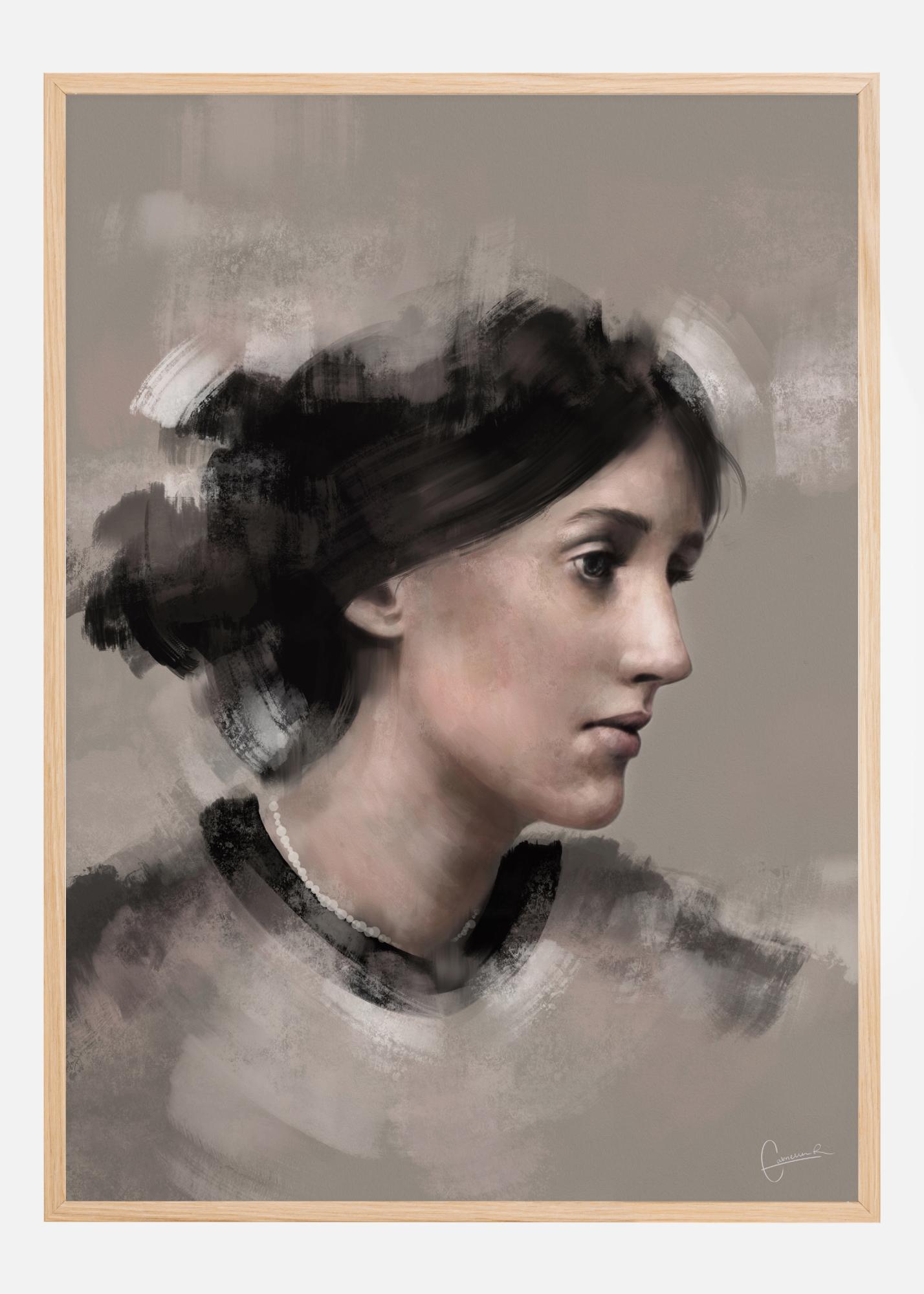 Ein Porträtposter von Virginia Woolf im Profil. Ihr Haar ist ein einfacher, weicher Farbklecks, aber ihr Gesicht ist sehr detailliert wiedergegeben. Das Porträt ist weich und feminin und verleiht ihrem Gesicht eine fast melancholische Note, während sie in die Ferne blickt.