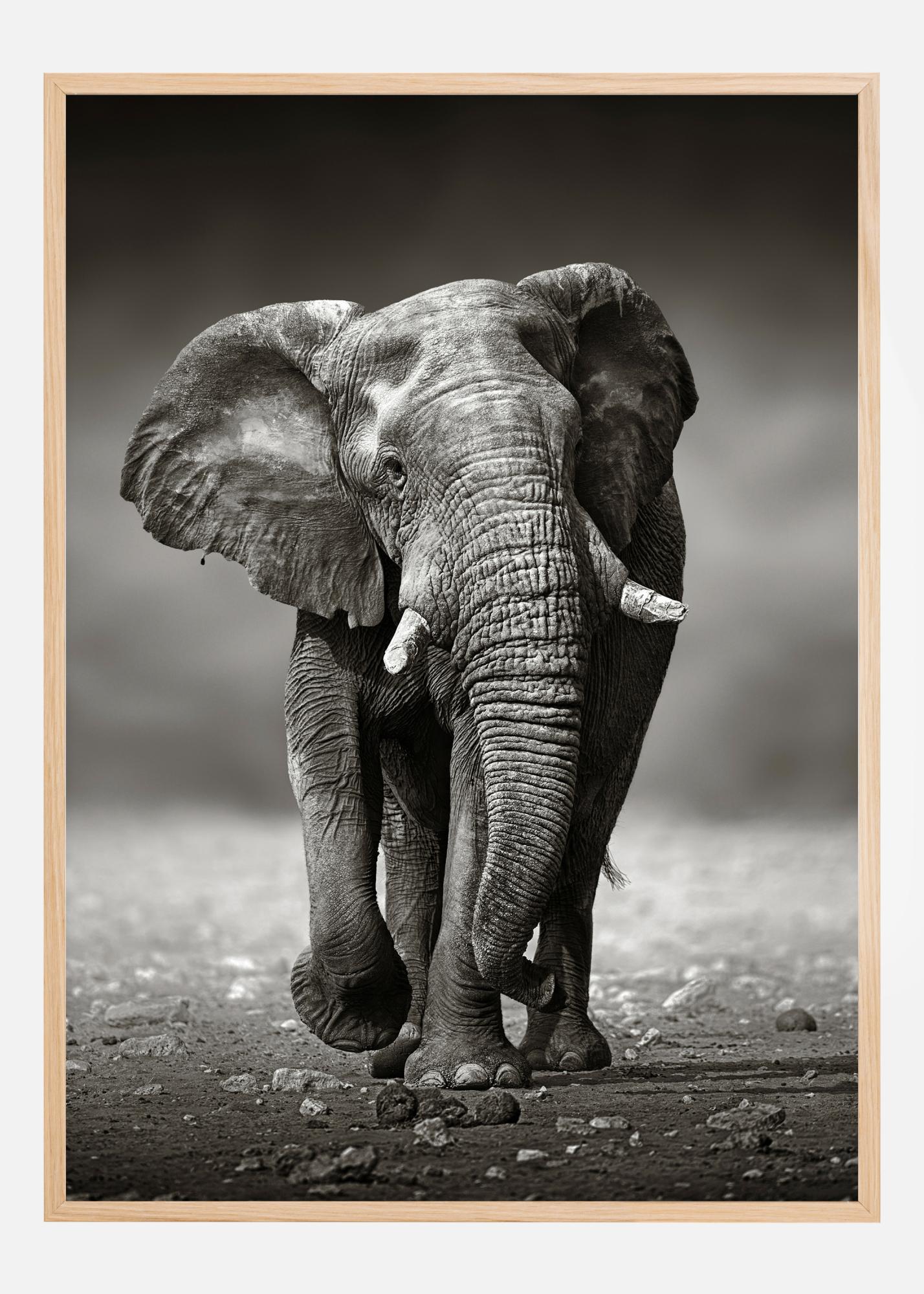Ein prächtiges Poster eines Elefanten in Schwarz-Weiß. Der Elefant bewegt sich in der Mitte des Weges auf die Kamera zu. Er sieht jung aus, hat kurze weiße Stoßzähne und einen ruhigen Gesichtsausdruck. Besuchen Sie Afrika, wenn Sie dieses Bild in Ihrem Haus bewundern.