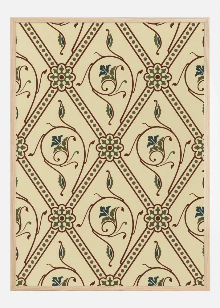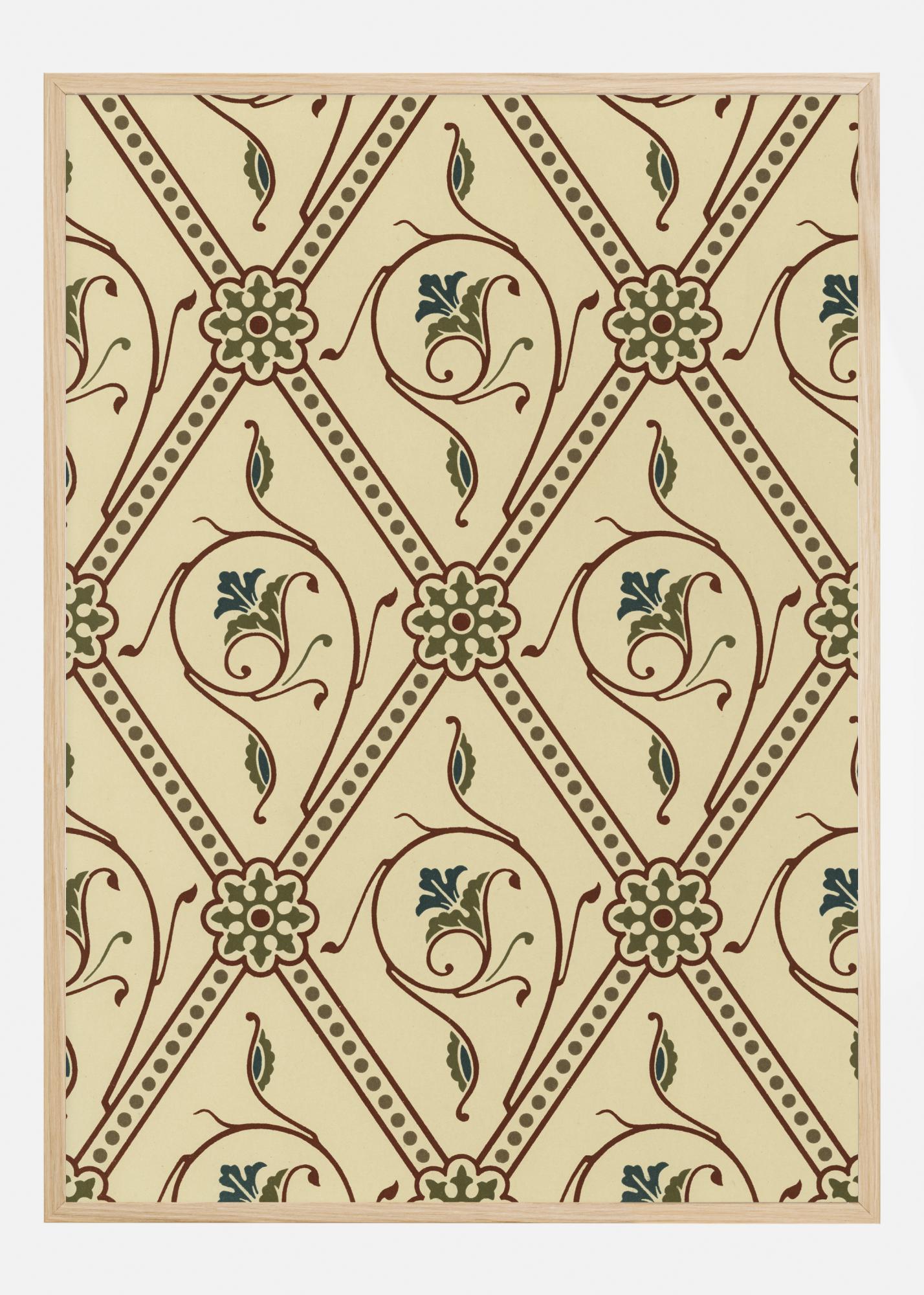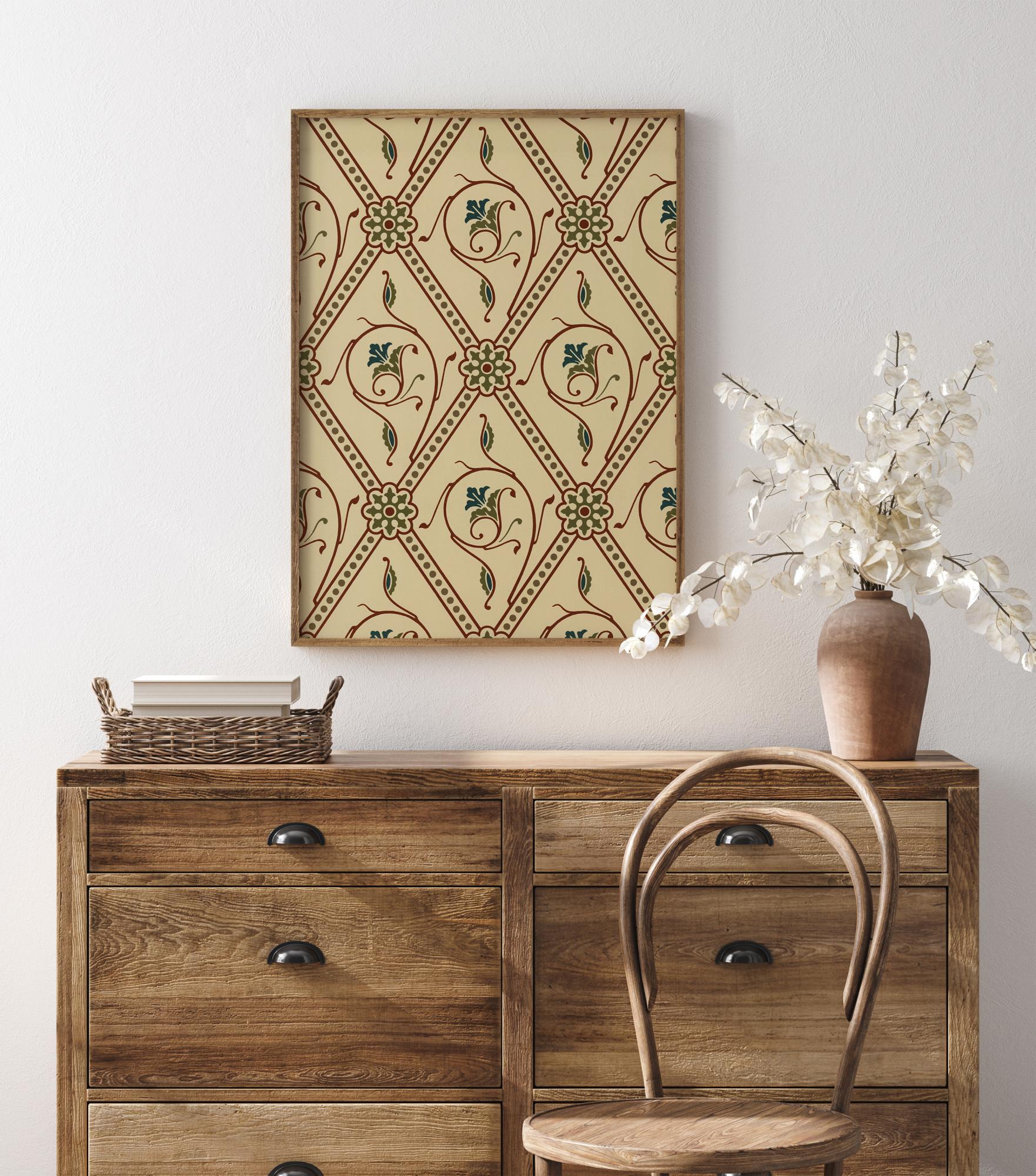 Ein Tapetenposter mit cremefarbenen, roten und grünen Mustern. Große Rauten bilden die Hauptrahmen des Musters. In jedem Rautenmuster befinden sich rote Linien, die in grünen und blauen Blatt- und Blütenformen enden. Das Muster ist elegant und fließend und eignet sich perfekt, um eine schlichte Wand mit etwas anderem aufzupeppen.