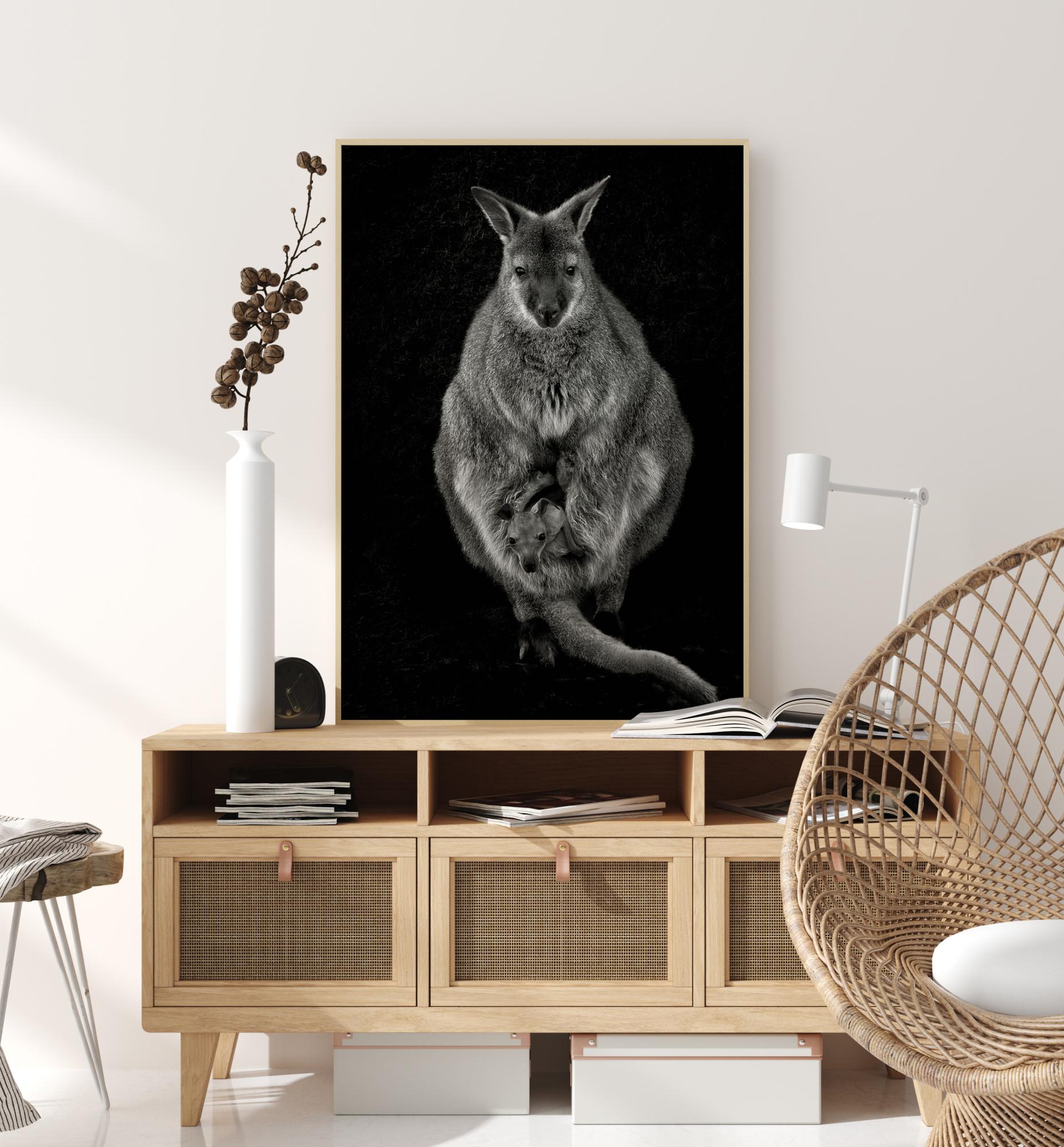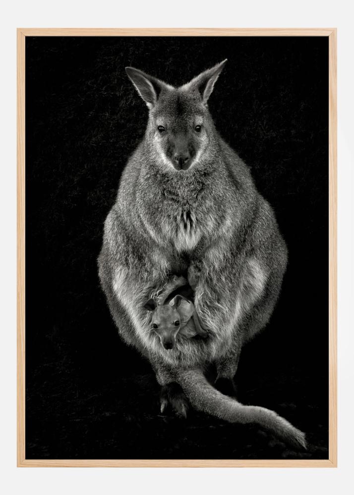 Ein Naturposter von einem Wallaby und seinem Baby. Die beiden heben sich in dieser atemberaubenden Aufnahme vor einem schwarzen Hintergrund ab. Beim Anblick dieser Mutter und ihres Kindes bekommt man ein niedliches, kuscheliges Gefühl.