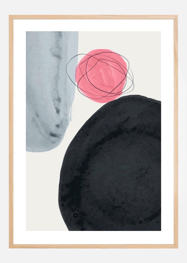 Ein lebhaftes abstraktes Poster mit großen Formen, die das gesamte Bild ausfüllen. Ein großer schwarzer Kreis füllt die untere rechte Seite. Darüber befindet sich ein kleiner rosafarbener Kreis, um den sich dünne schwarze Linien spiralförmig winden. Eine letzte hellblaue Form hängt von oben links herab.