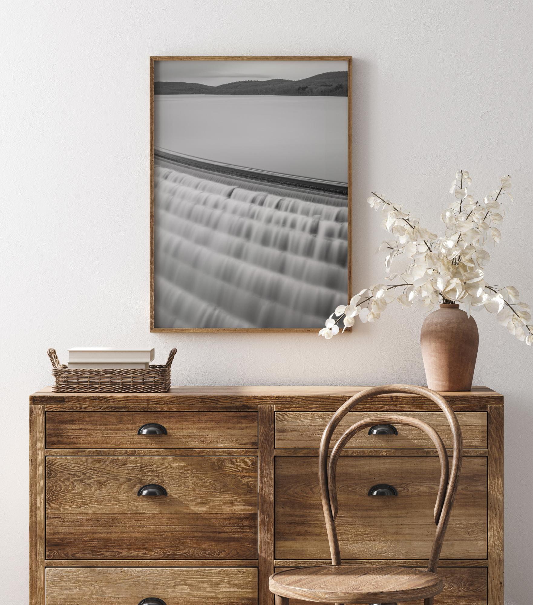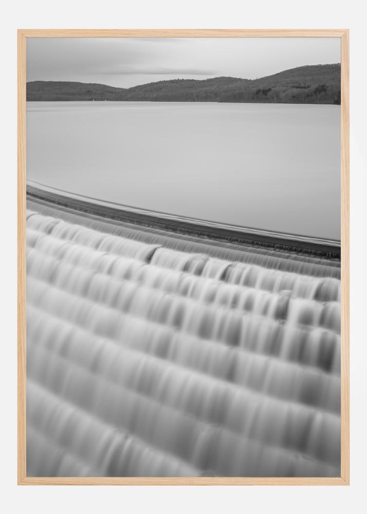 Ein graues Poster mit Mini-Wasserfällen, die über einen künstlichen Damm an einem See stürzen. Das ruhige graue Wasser dehnt sich mit den winzigen Wasserfällen aus, die über die kleinen Felsvorsprünge strömen und ein sich schnell bewegendes Muster bilden. Entspannen Sie sich und lassen Sie Ihre Augen den herabfließenden Wasserströmen folgen.