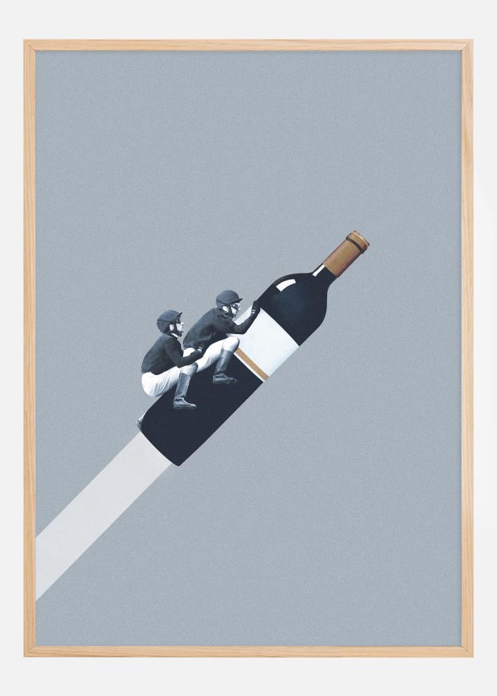 Das Farbschema ist gedämpft, aber ausdrucksstark, wobei die kühlen Blautöne im Hintergrund die dunkleren Töne der Reitkleidung und das tiefe Schwarz der Weinflasche ergänzen. Es kombiniert eine moderne Ästhetik mit einem Hauch von Nostalgie, was dieses Poster zu einem perfekten künstlerischen Akzent in Häusern macht, die eine Mischung aus Tradition und Humor schätzen. Es ist eine zeitgenössische Interpretation davon, den Sturm zu überstehen, die jedem Raum eine stilvolle und gleichzeitig humorvolle Note verleiht.