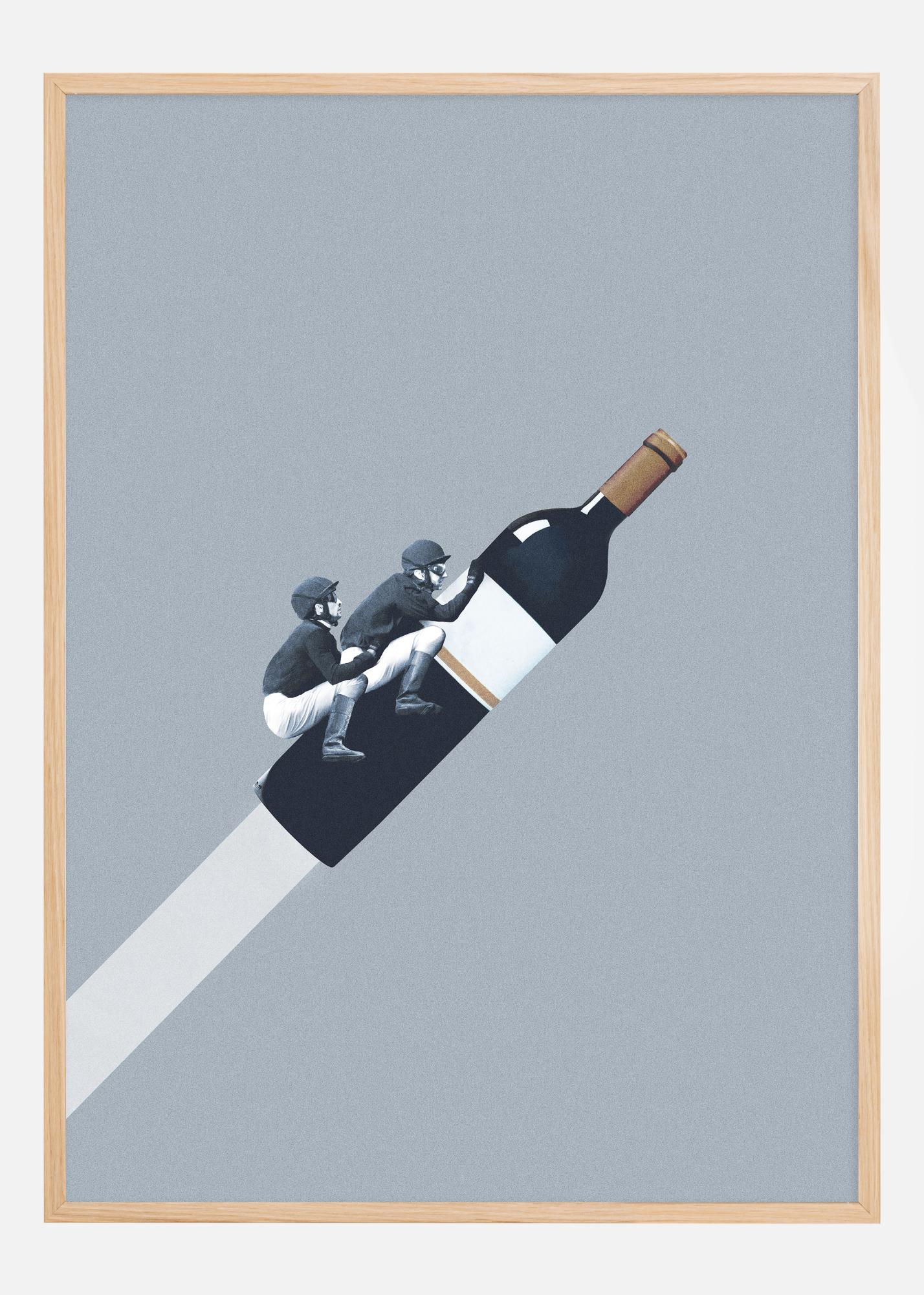 Dieses einzigartige und zum Nachdenken anregende Poster fängt eine fantasievolle Szene ein, in der zwei Personen in klassischer Reitkleidung triumphierend auf einer schräg stehenden Weinflasche reiten. Die Szene ist ein Werk kreativer Fantasie, das Traditionelles mit Absurdem verwebt und ein Gefühl von Abenteuer und Eskapismus darstellt. Es zeigt, wie zwei Reiter die alltäglichen Weinwellen des Lebens mit derselben anmutigen Beherrschung meistern können, als ob sie durch die hügelige Landschaft reiten würden.