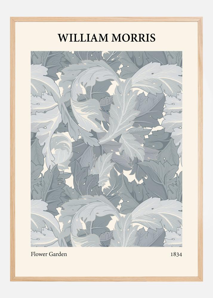 Dieses Poster mit dem üppigen und raffinierten William Morris-Motiv bietet ein Gefühl von sowohl Ruhe als auch klassischer Eleganz. Das Design ist eine Ode an die reichliche Vegetation, die oft mit Morris und seiner Arbeit innerhalb der Arts-and-Crafts-Bewegung assoziiert wird. Das Motiv, genannt "Flower Garden", enthält eine verdichtete Komposition von Blättern und Blüten, dargestellt in kühlen Tönen von Blau und Grau mit Akzenten von Cremeweiß. Jedes Detail in diesem Poster ist sorgfältig durchdacht, was ein Gefühl von einem tugendhaften und geordneten Garten erzeugt.