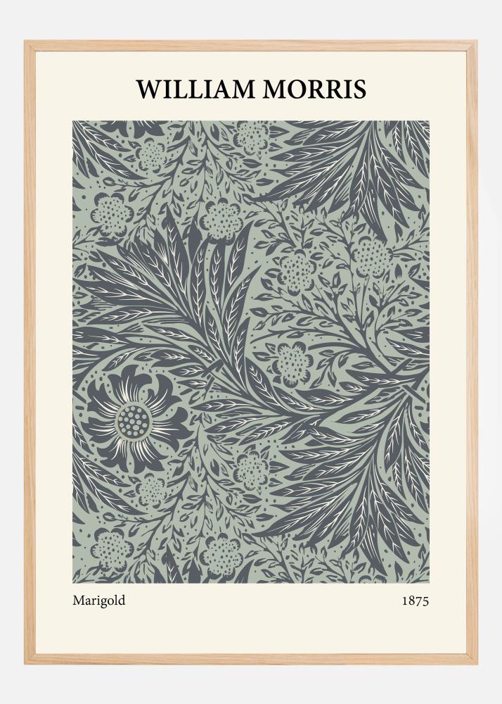 Dieses William Morris-Poster mit seinem bezaubernden "Marigold"-Muster von 1875 zeigt Morris' einzigartige Fähigkeit, detaillierte und harmonische botanische Illustrationen zu schaffen. Das Motiv ist voller Leben und Bewegung, mit seinen sich schlängelnden Blättern und Blumen, die scheinbar direkt aus dem Papier wachsen. Die Farben, in beruhigenden Tönen von Grün und dunkleren Akzentnuancen, erzeugen einen eleganten und zugleich naturgetreuen Eindruck.