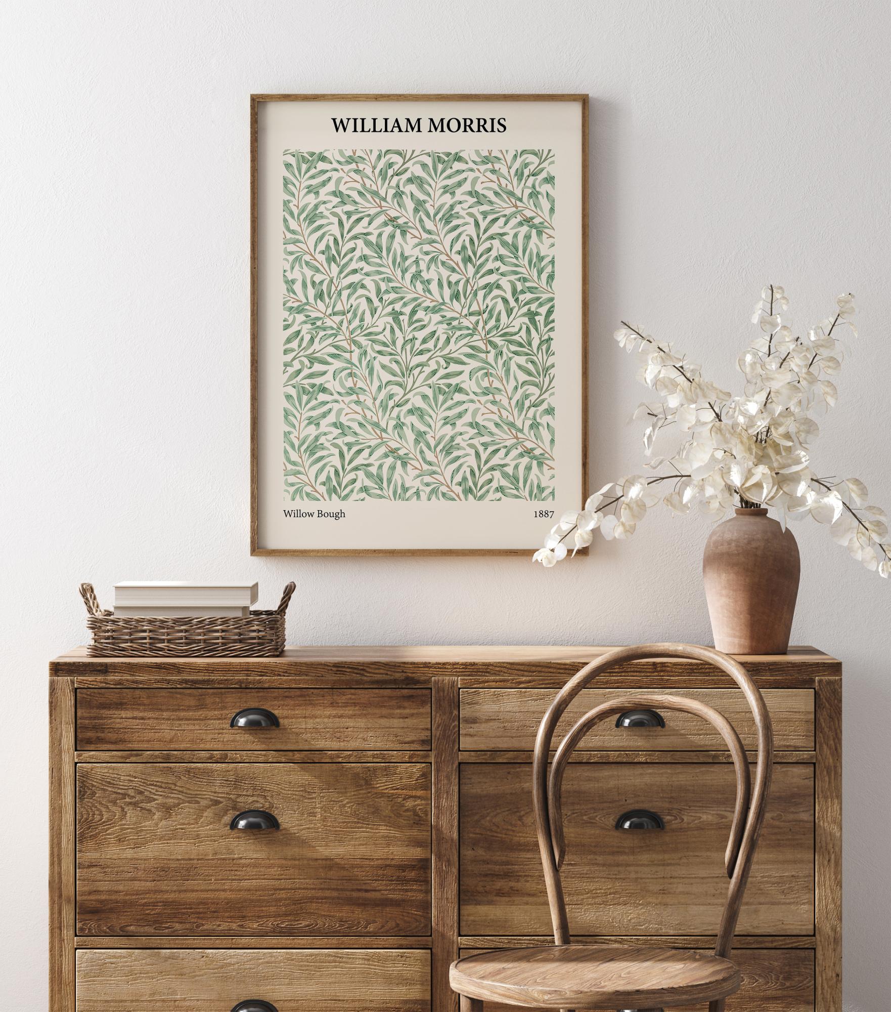 Ein gemustertes Poster eines William-Morris-Drucks mit Weidenzweigen. Die einfachen grünen Blätter füllen das Bild und werden durch dünne Zweige verbunden, die ein kompliziertes Muster über das gesamte Bild bilden. Fügen Sie dieses Poster einer pastellfarbenen Wand hinzu und schaffen Sie so einen etwas anderen Eindruck.