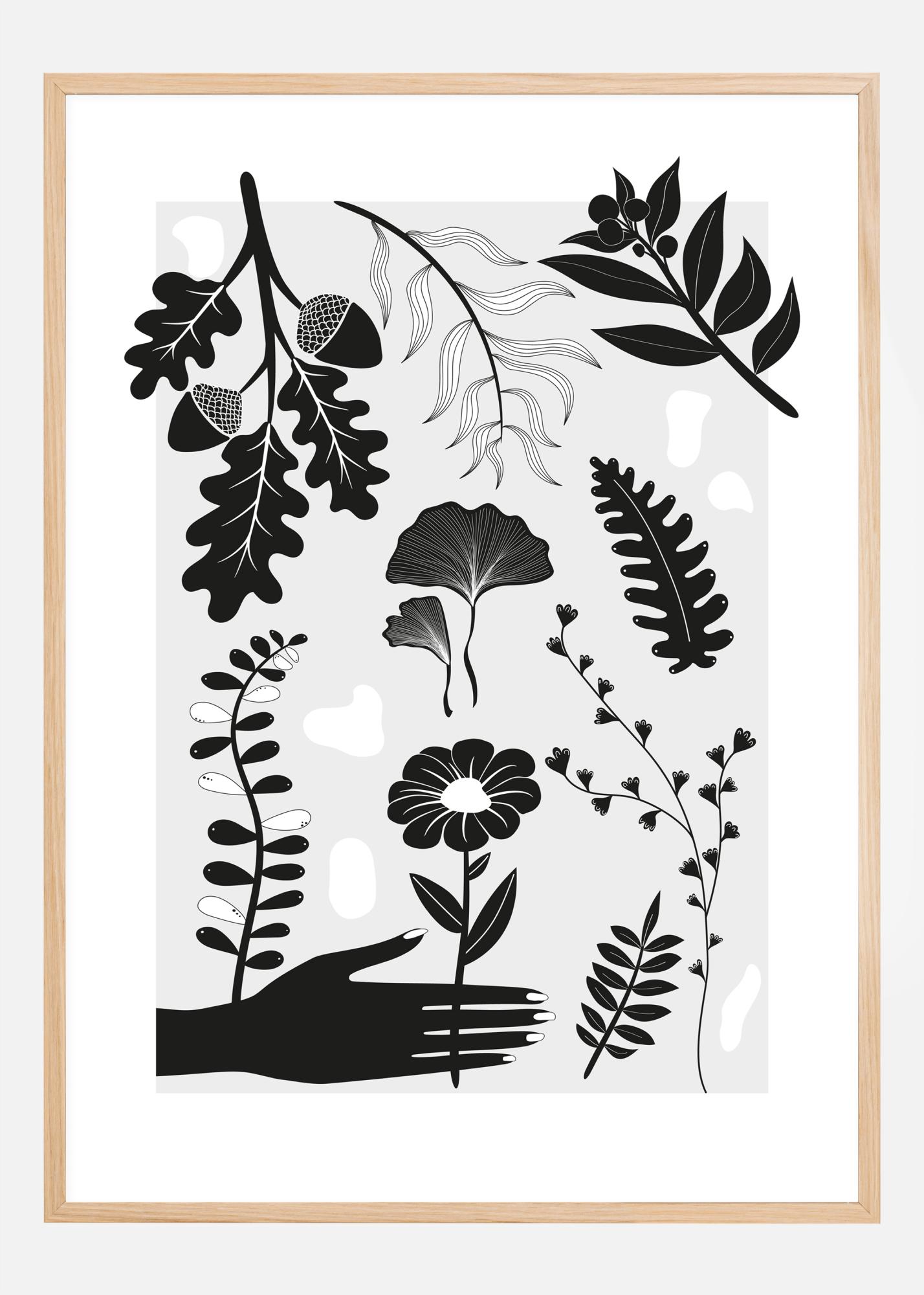 Ein kühnes Poster mit schwarzen und weißen Druckmustern von verschiedenen Blättern, Pflanzen und Blumen. Eine schwarze Hand streckt sich aus, um eine der stilisierten Blumen zu greifen. Eicheln, Blumen, Farne und mehr füllen diesen einfachen, aber interessanten Druck. Bringen Sie sich in Botanik-Stimmung, wenn Sie dieses Pflanzenposter in Ihrem Zuhause anbringen.