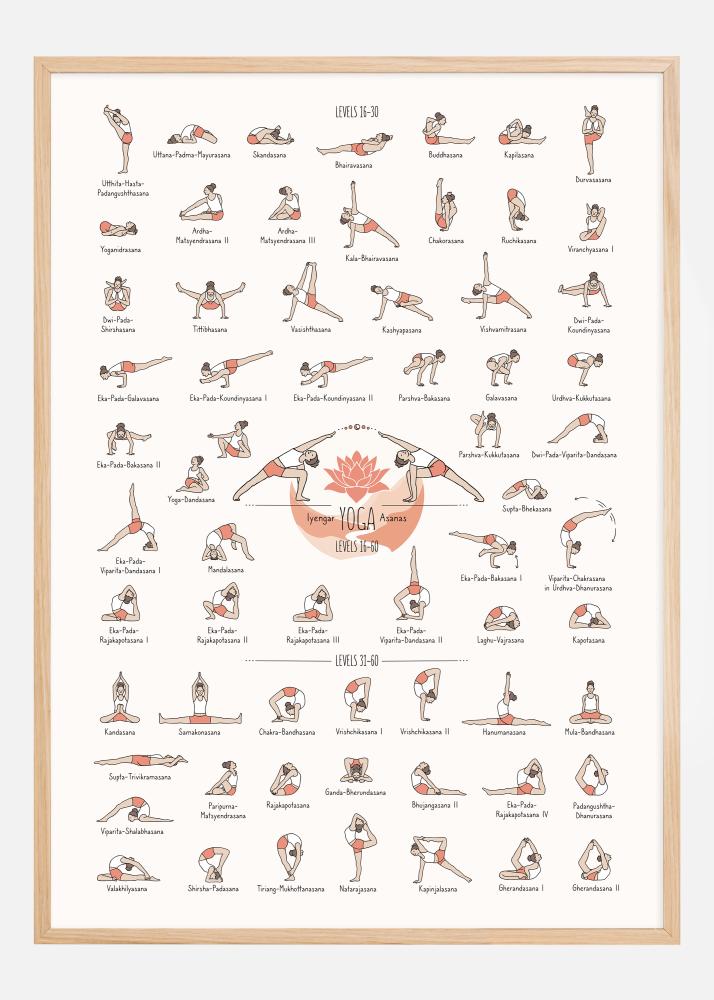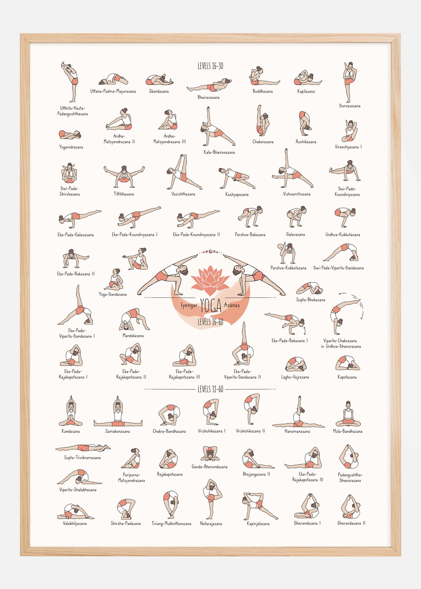 Im Zentrum des Posters steht der Titel 'Iyengar YOGA Asanas', umgeben von einer Lotusblume, die tief in der Symbolik des Yoga verwurzelt ist. Das Design des Posters ist nicht nur optisch ansprechend, sondern auch praktisch und kann als Referenz während der Yogapraxis oder als dekorative Inspirationsquelle in Yogastudios und zu Hause verwendet werden. Darüber hinaus kann sein warmes und einladendes Farbschema leicht zu verschiedenen Einrichtungsstilen passen und eine ruhige und einladende Atmosphäre schaffen, wo immer es platziert wird.