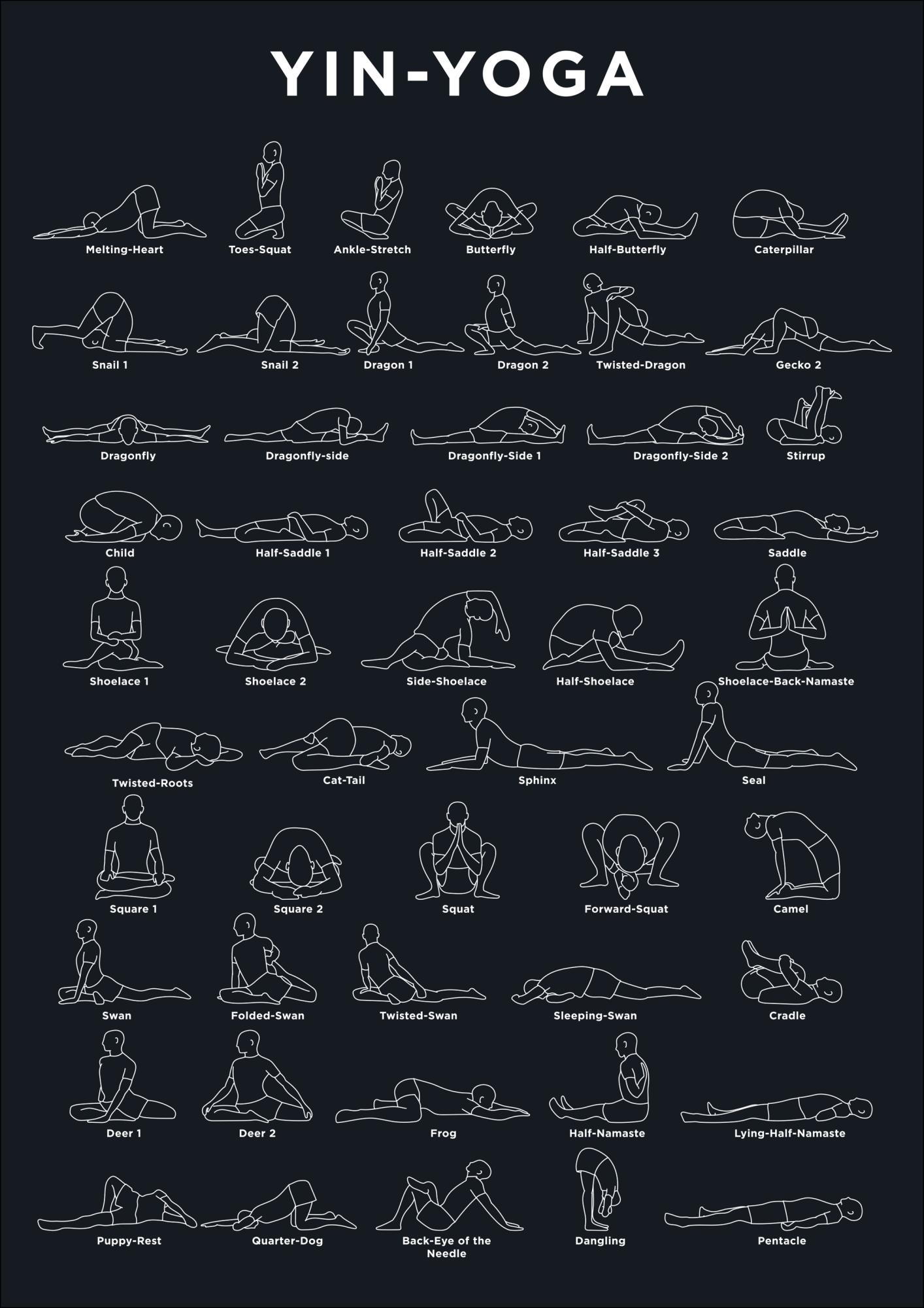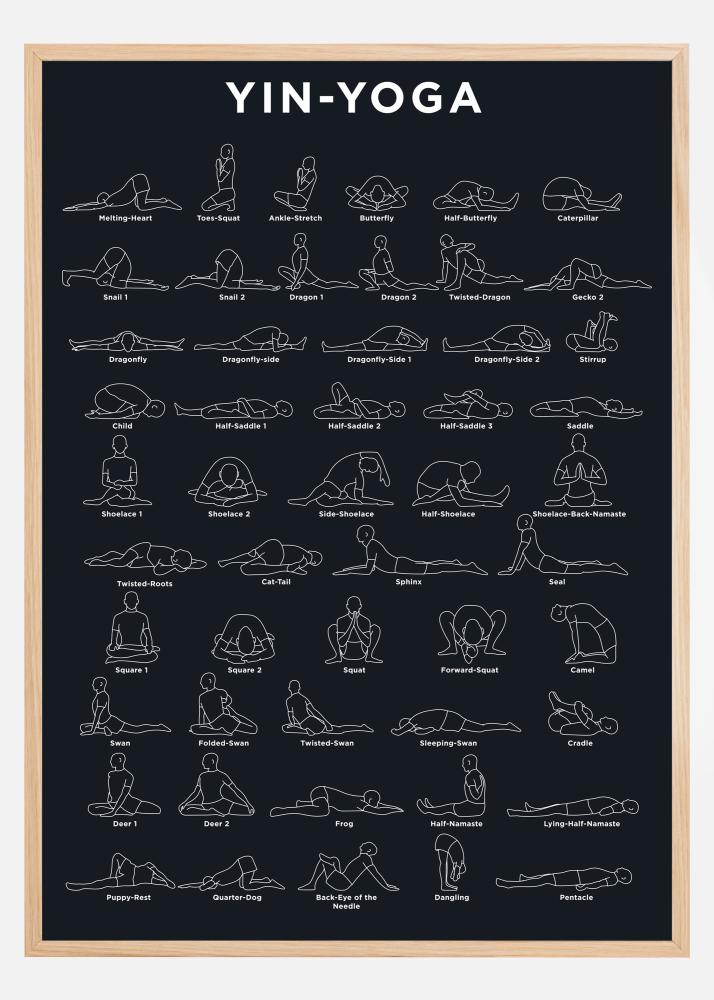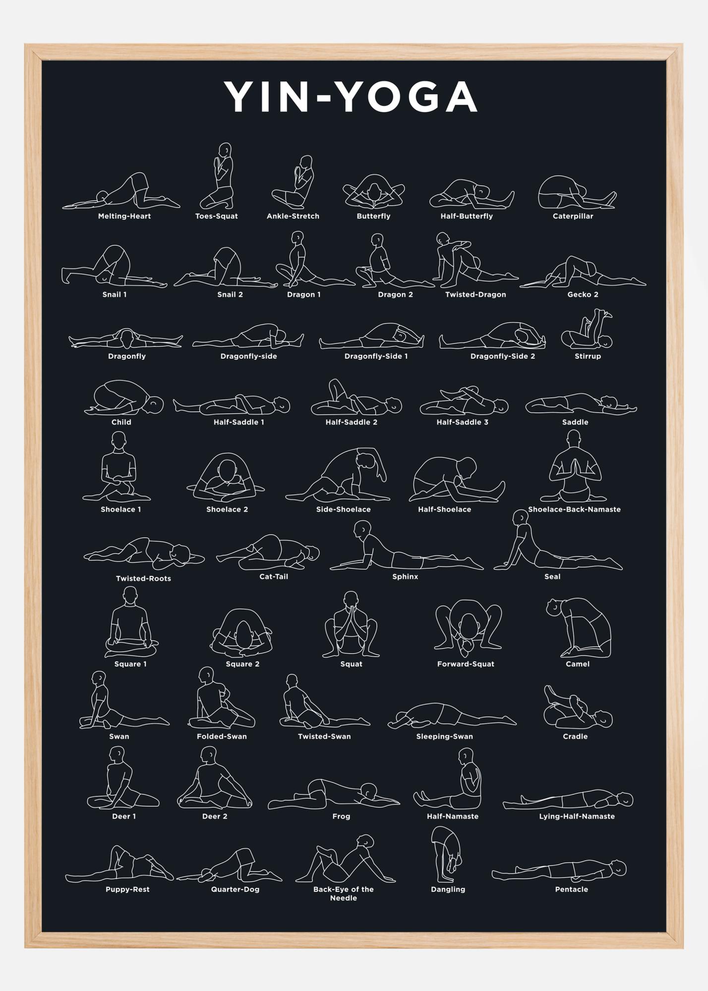 Ein nützliches Poster mit den verschiedenen Yogastellungen, die es gibt. Weiße Figuren sind in den verschiedenen Positionen auf einem schlichten marineblauen Hintergrund abgebildet, darunter steht der Name der jeweiligen Stellung. Hängen Sie sich dieses Poster zur Motivation an die Wand und dehnen Sie sich bis zum Äußersten.