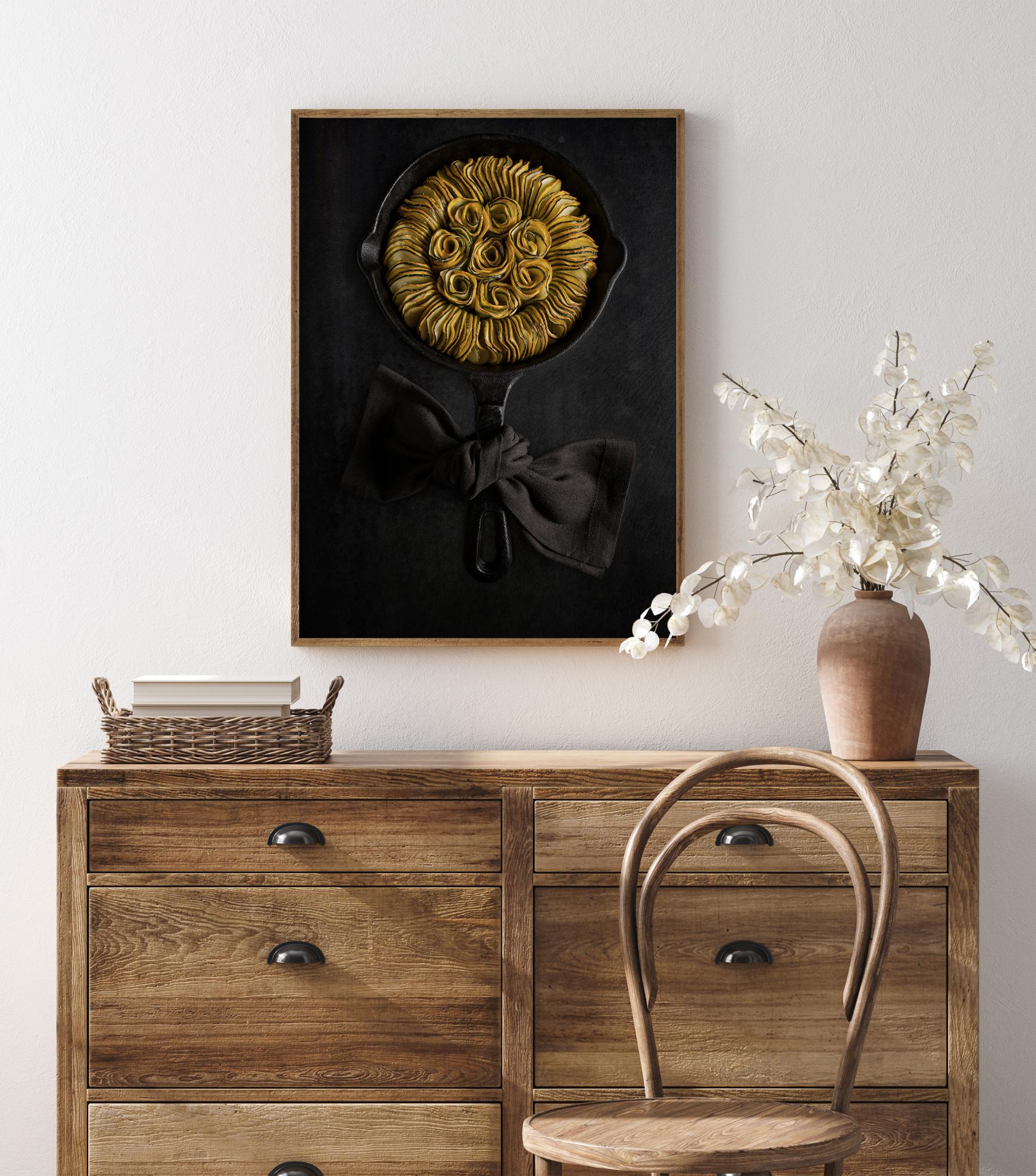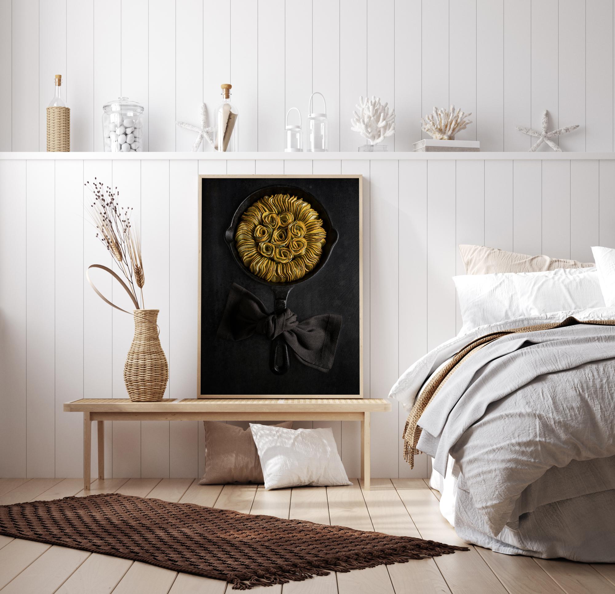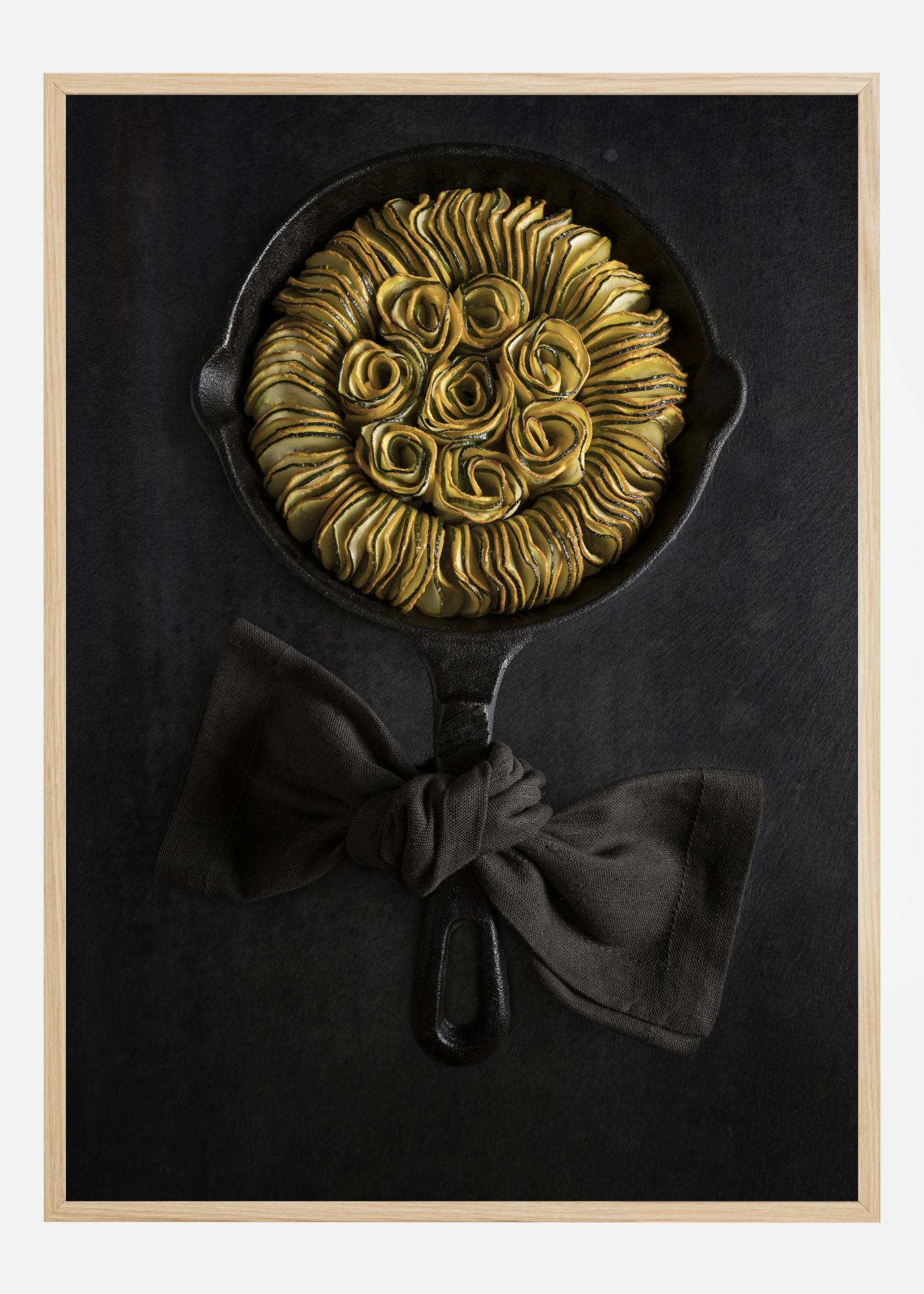 Ein köstliches Poster mit Zucchini-Ratatouille, bei dem die Zucchini elegant in einer Pfanne eingewickelt sind, so dass sie die Form einer Sonnenblume annehmen. Die gelben und grünen Zucchini heben sich von der schwarzen Bratpfanne ab, um deren Griff eine Stoffschleife gebunden ist. Hängen Sie es in Ihrer Küche auf und probieren Sie, ob Sie dieses verlockende Gericht zubereiten können.